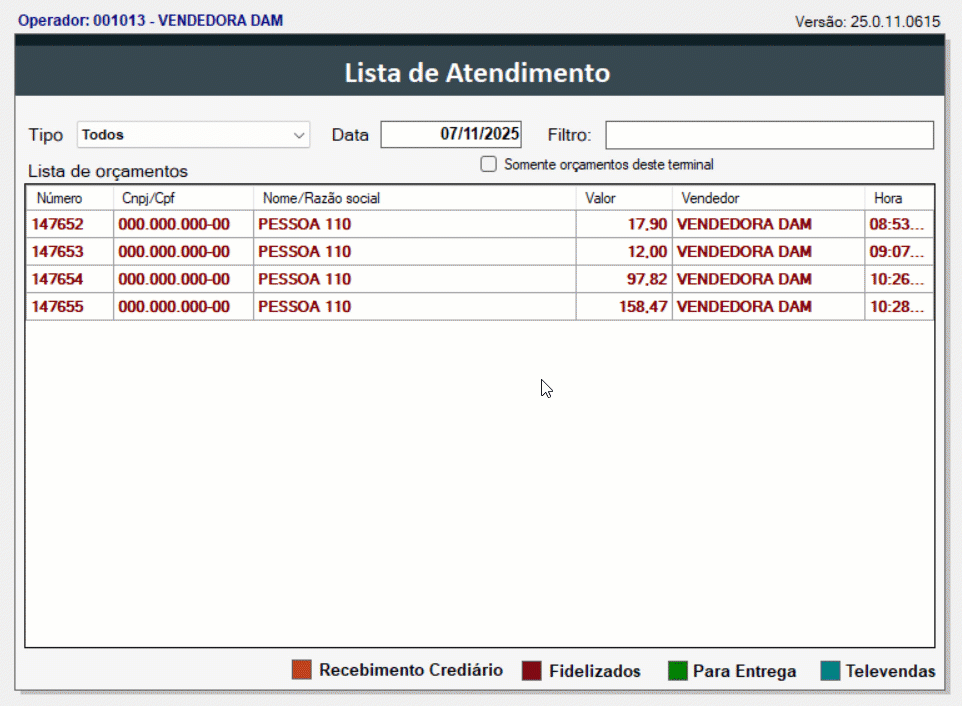 Ao abrir a tela "Lista de Atendimento", o operador deverá realizar a captura do orçamento que deseja finalizar no módulo PDV. Os orçamentos de clientes fidelizados são exibidos em vermelho, facilitando sua identificação, e para selecionar, basta clicar duas vezes sobre o orçamento desejado. Em seguida, será necessário realizar o check-out dos produtos e avançar para a finalização da venda. Caso queira consultar o passo a passo completo desses procedimentos, clique aqui para acessar a documentação detalhada da tela "Lista de atendimento".