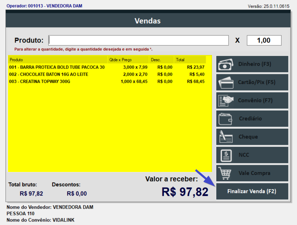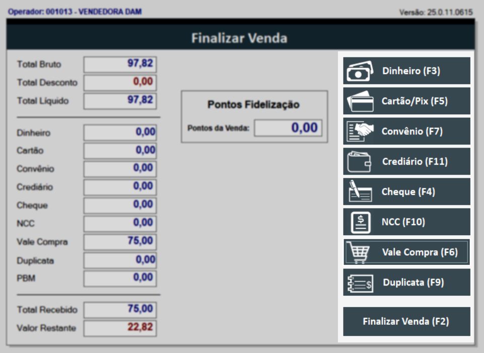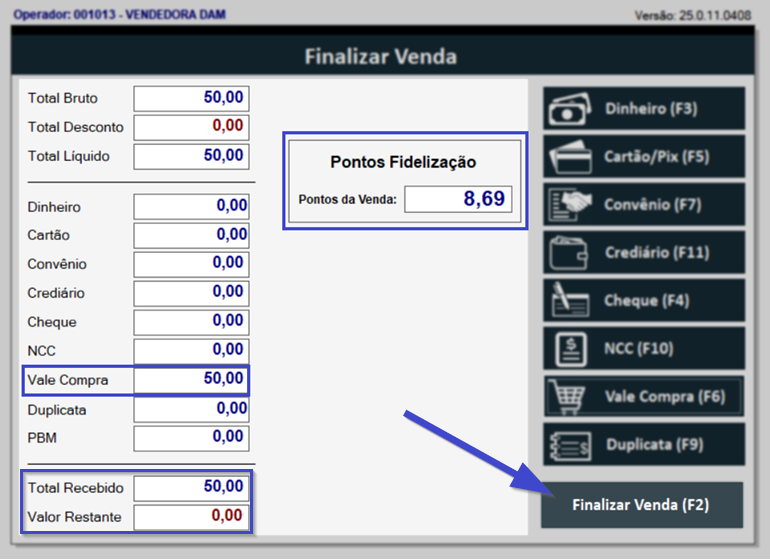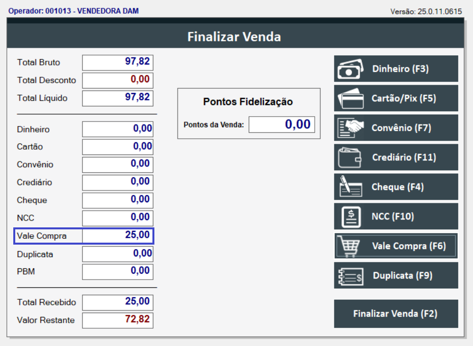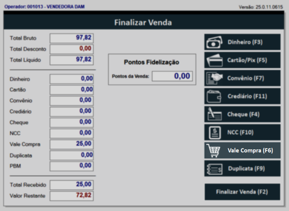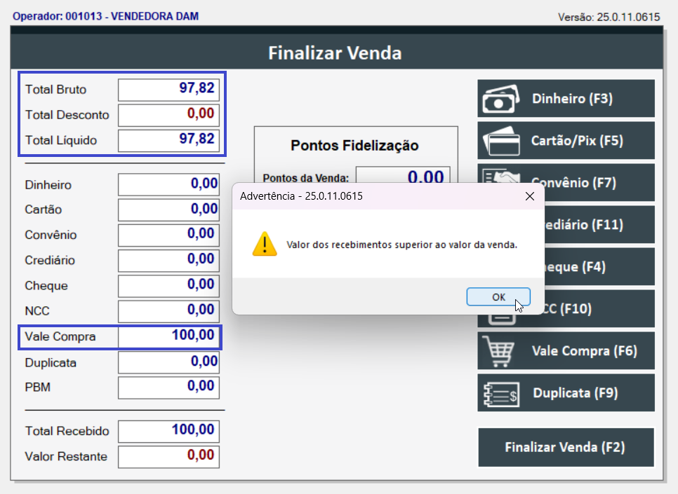 Quando o valor da venda for superior ao valor do vale-compra, será necessário selecionar outra forma de pagamento, ou, adicionar outro vale-compra para complementar o valor restante e, somente após, finalizar a venda. Confira a seguir.