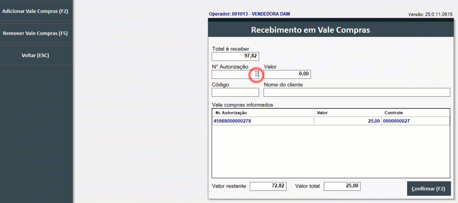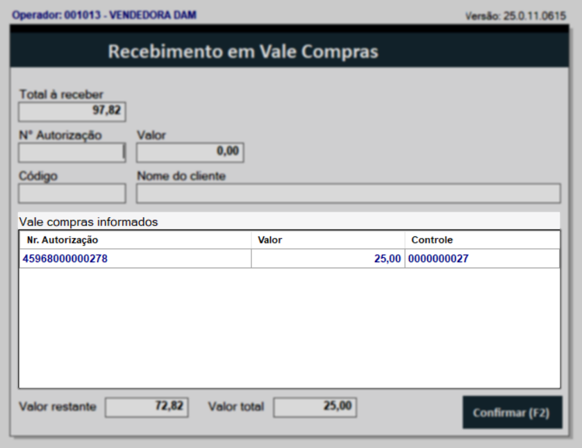 Conforme forem realizadas a inclusão ou remoção dos vales-compra, o campo “Valor restante” é atualizado automaticamente, indicando o valor que ainda falta para quitar a venda. Já o campo “Valor total”, apresenta a soma dos valores de todos os vales-compra adicionados até o momento. Por fim, após a inclusão dos vales-compra desejados, clique no botão >> Confirmar (F2) ou tecle diretamente o atalho >> F2 para salvar.