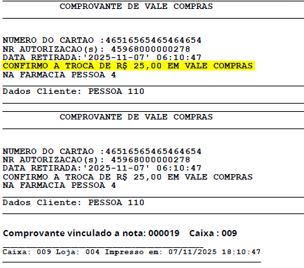 Após a finalização da venda, caso o operador opte por emitir o cupom fiscal, o valor do vale-compra será exibido no documento.