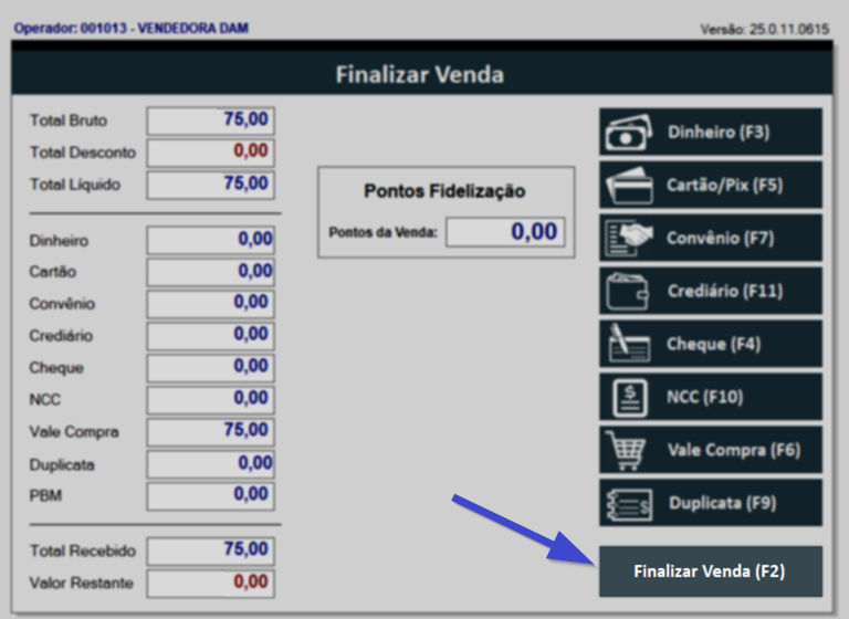 De volta à tela “Finalizar Venda”, após confirmar que a(s) forma(s) de recebimento correspondem ao valor total da compra, conclua o processo clicando em “Finalizar Venda (F2)”.