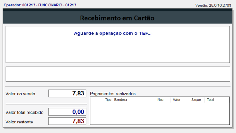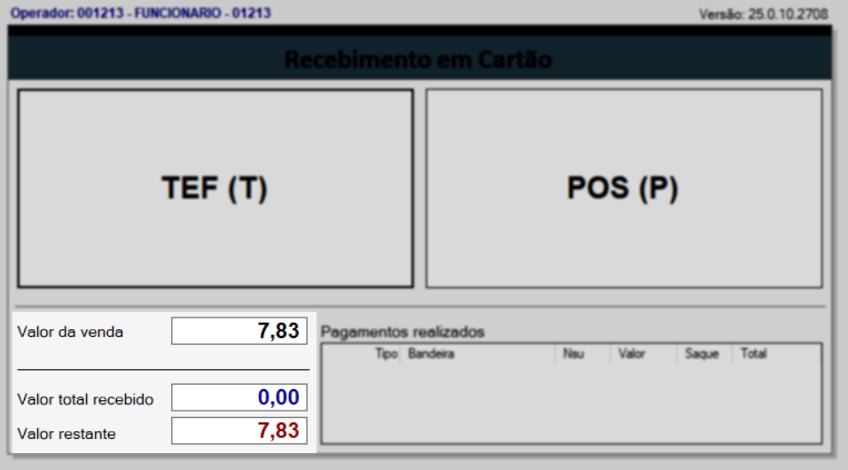 Em seguida, será exibida a tela “Recebimento em Cartão”, onde o usuário deverá selecionar a opção “TEF (T)” ou pressionar diretamente a tecla de atalho "T" para prosseguir com o pagamento digital.