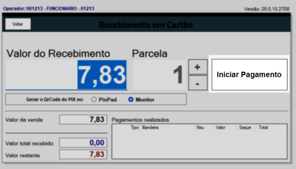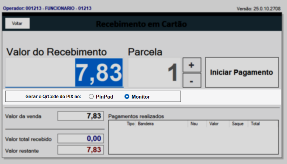 Caso o cliente não possua o equipamento PinPad e ainda assim selecione essa opção, o sistema identificará automaticamente a ausência do dispositivo e gerará o QR Code na tela do monitor.