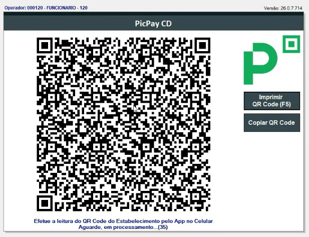 Se o QR Code for exibido no monitor, é possível imprimi-lo para facilitar a leitura, caso necessário. Para isso, clique no botão >> Imprimir QR Code (F5) ou pressione diretamente o atalho >> F5. Assim, o código será enviado para a impressora configurada no sistema. Além disso, também é possível copiar o QR Code clicando na opção “Copiar QR Code”.