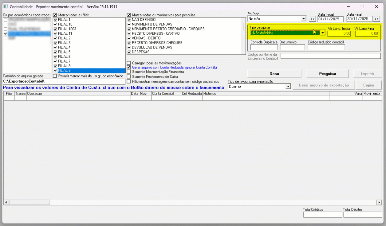 - Acesse o menu: Links >> Exportador Contábil >> Movimento contábil.