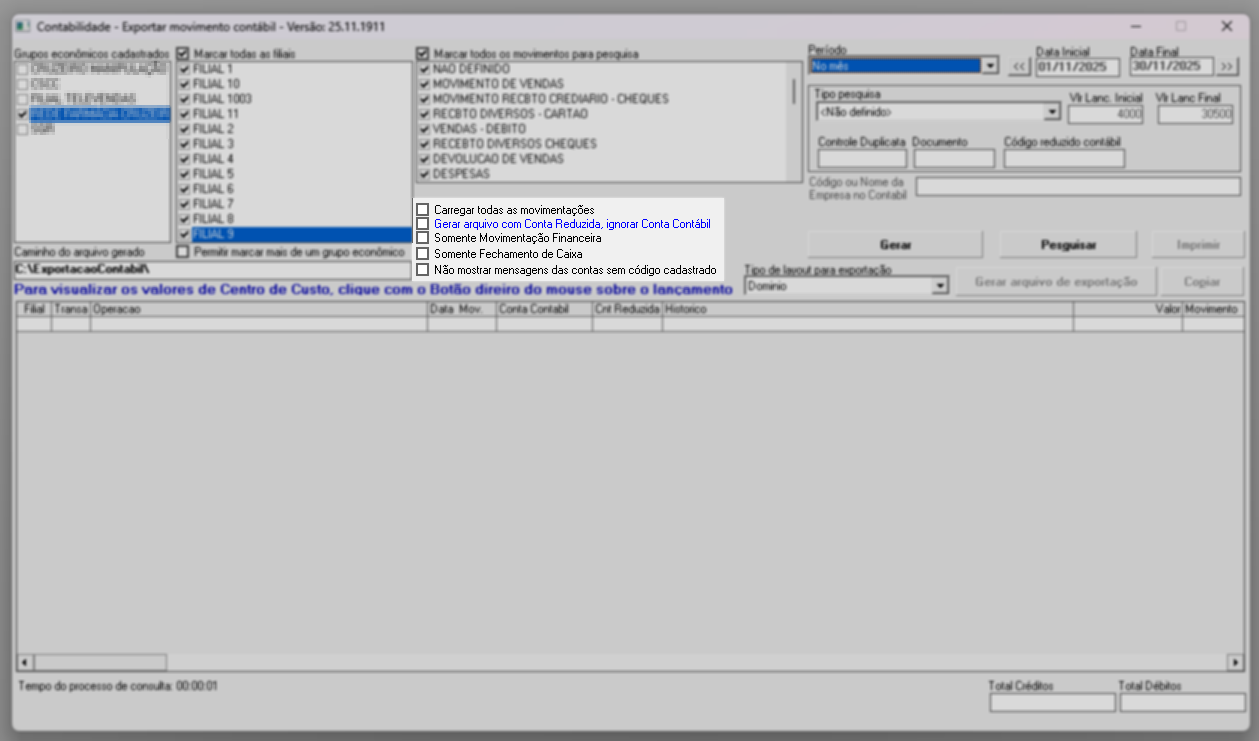- Gerar arquivo com conta reduzida e ignorar conta contábil: gera a exportação utilizando apenas a conta reduzida.
