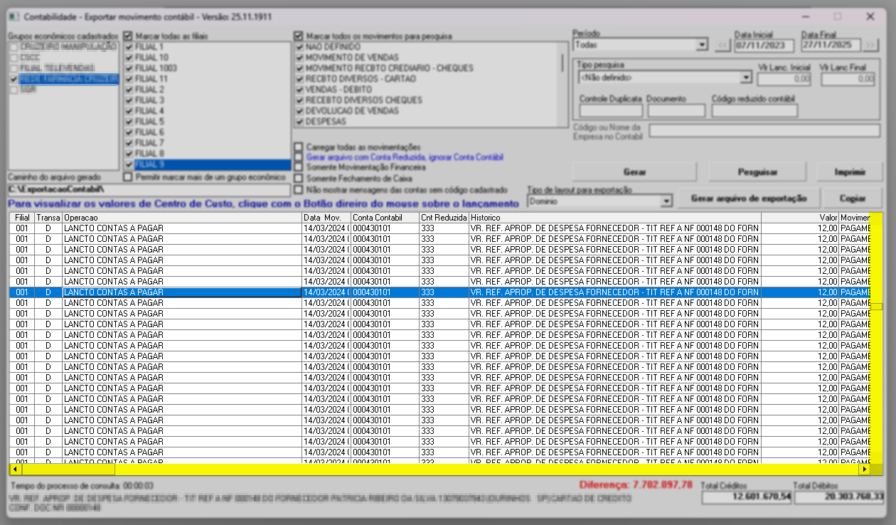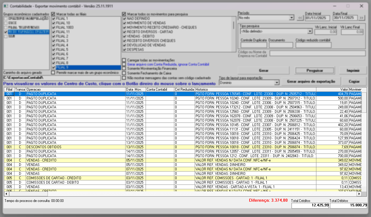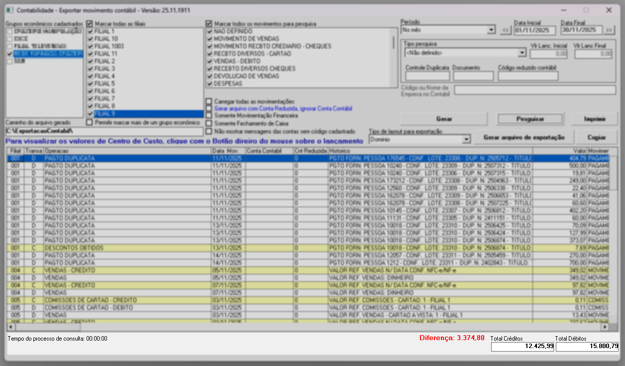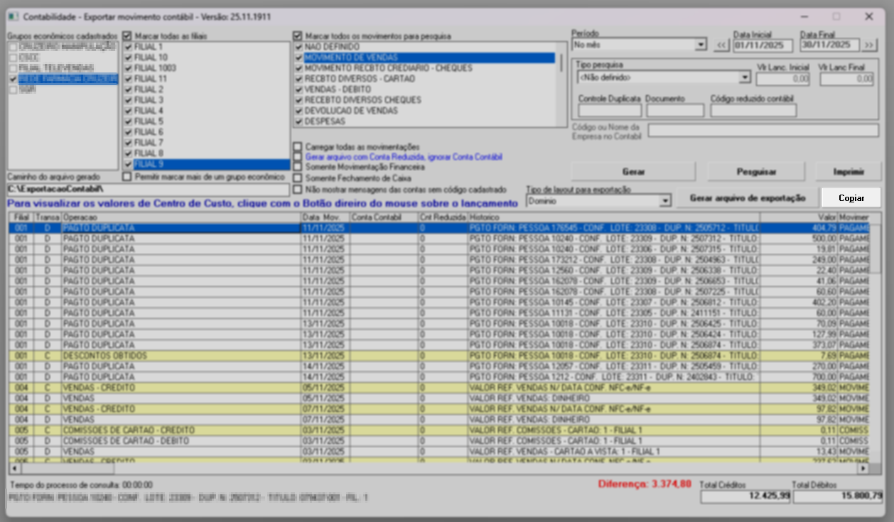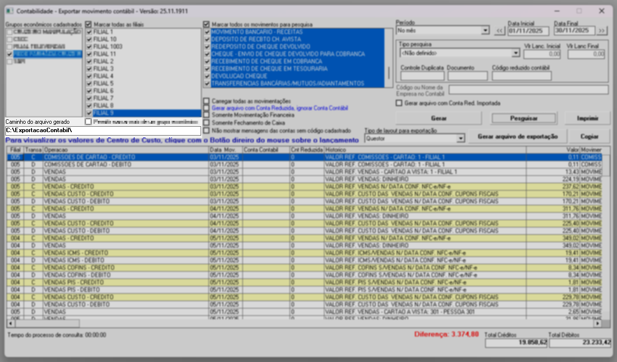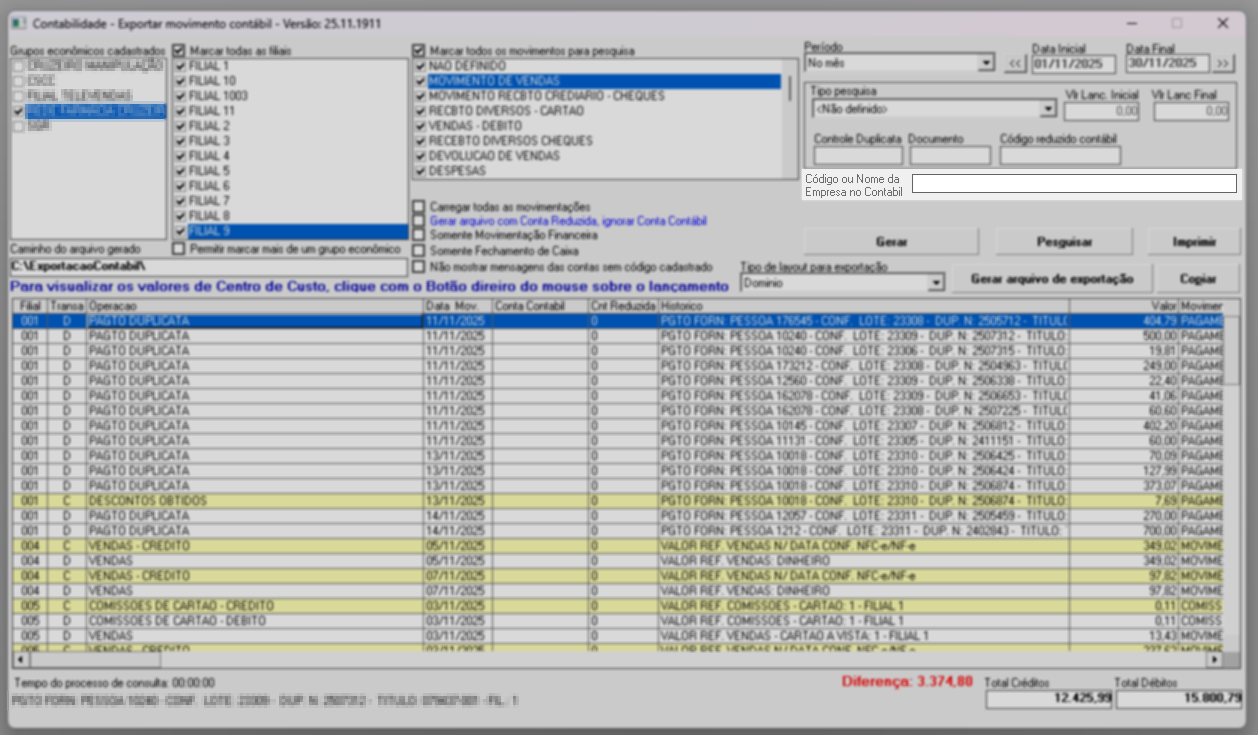 - Movimento contábil: gera um relatório de conferência contábil, separando as informações por tipo de movimentação, como lançamentos bancários, pagamentos a fornecedores, entre outros.