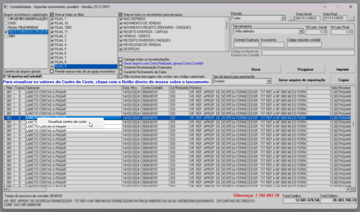 Os dados gerados são apresentados em colunas que contemplam diversas informações, como filial, transação (identificada com C = Crédito e D = Débito), operação, data do movimento, conta contábil, conta reduzida, histórico, valor, movimento, procedure (registro de banco de dados), condição de conta, rateio de centro de custo, ano da operação, centro de custo, data de geração, centro de custo reduzido e origem dos dados.
