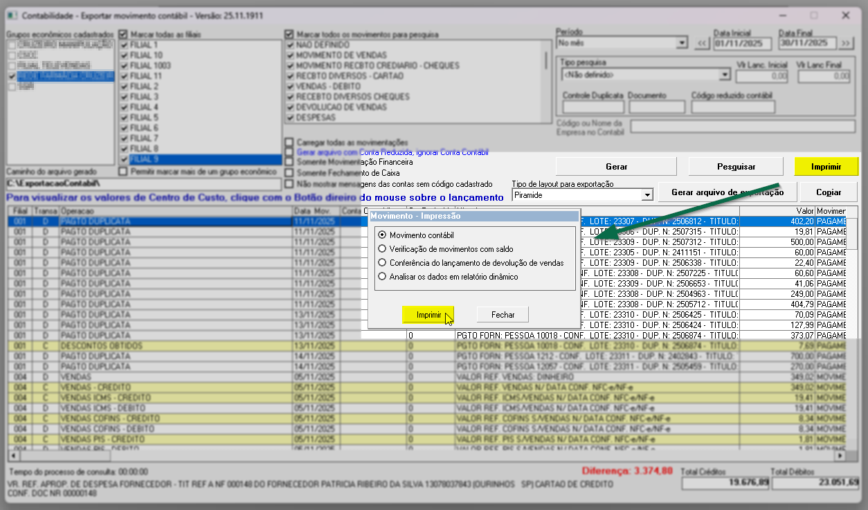Caso a intenção seja analisar as movimentações antes da exportação, o sistema disponibiliza o botão >> Imprimir , que abre a tela Movimento – Impressão: