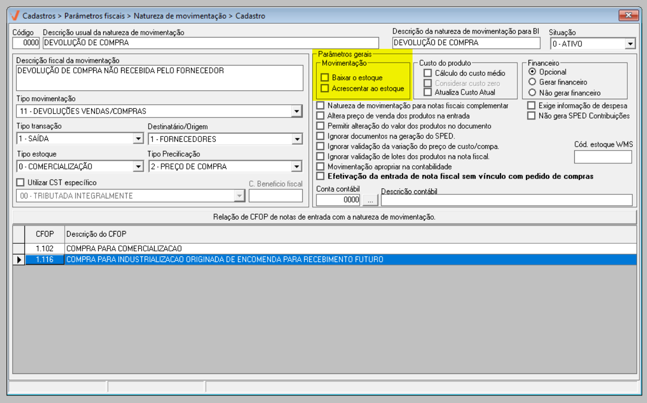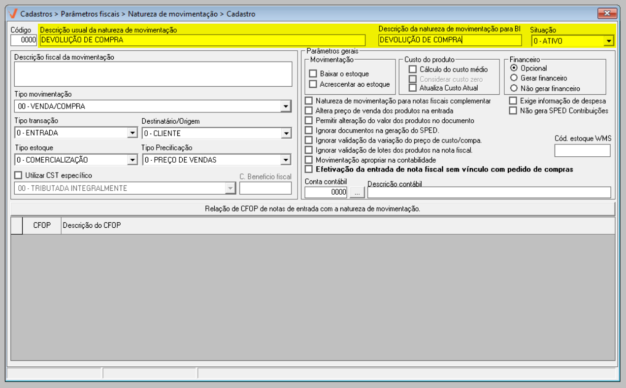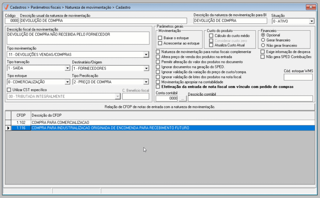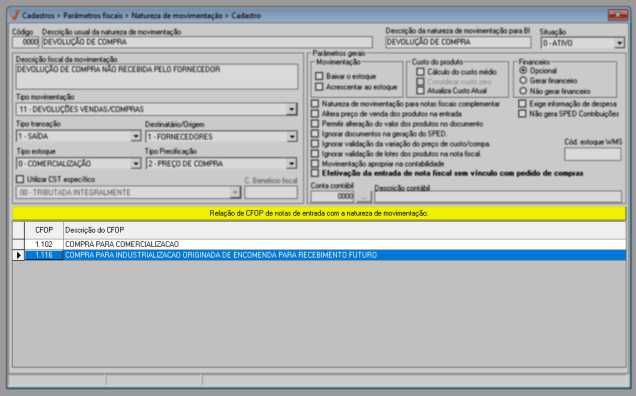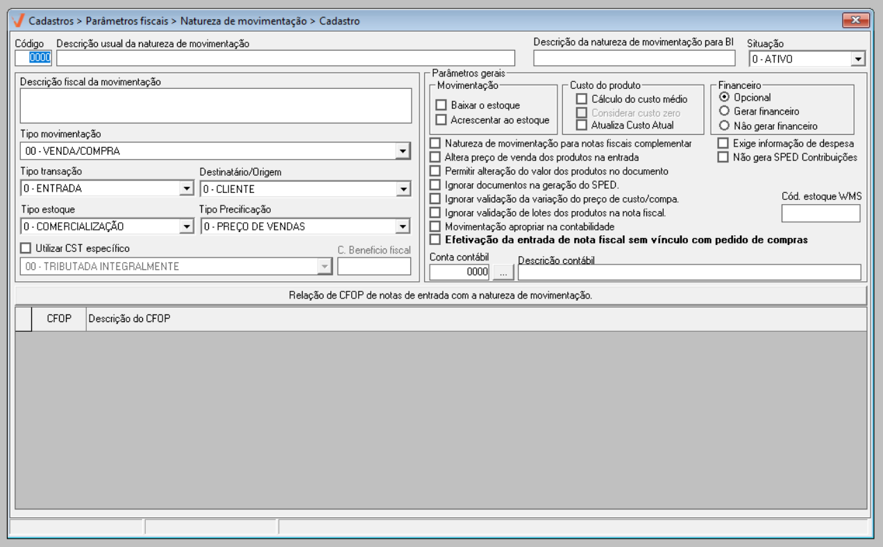 - Em seguida, o menu: Cadastros >> Parâmetros fiscais >> Natureza de movimentação >> Cadastro.