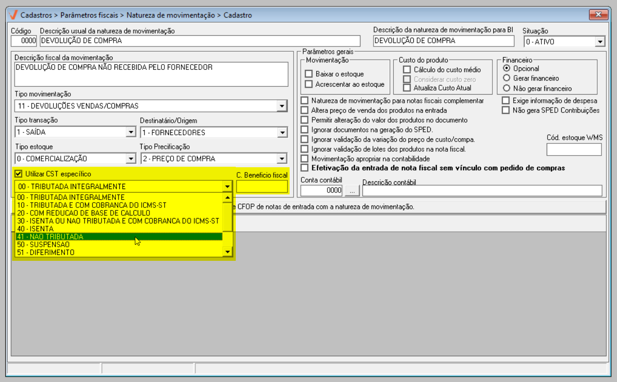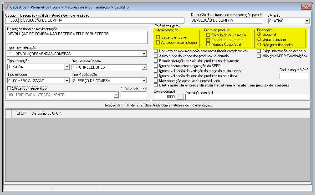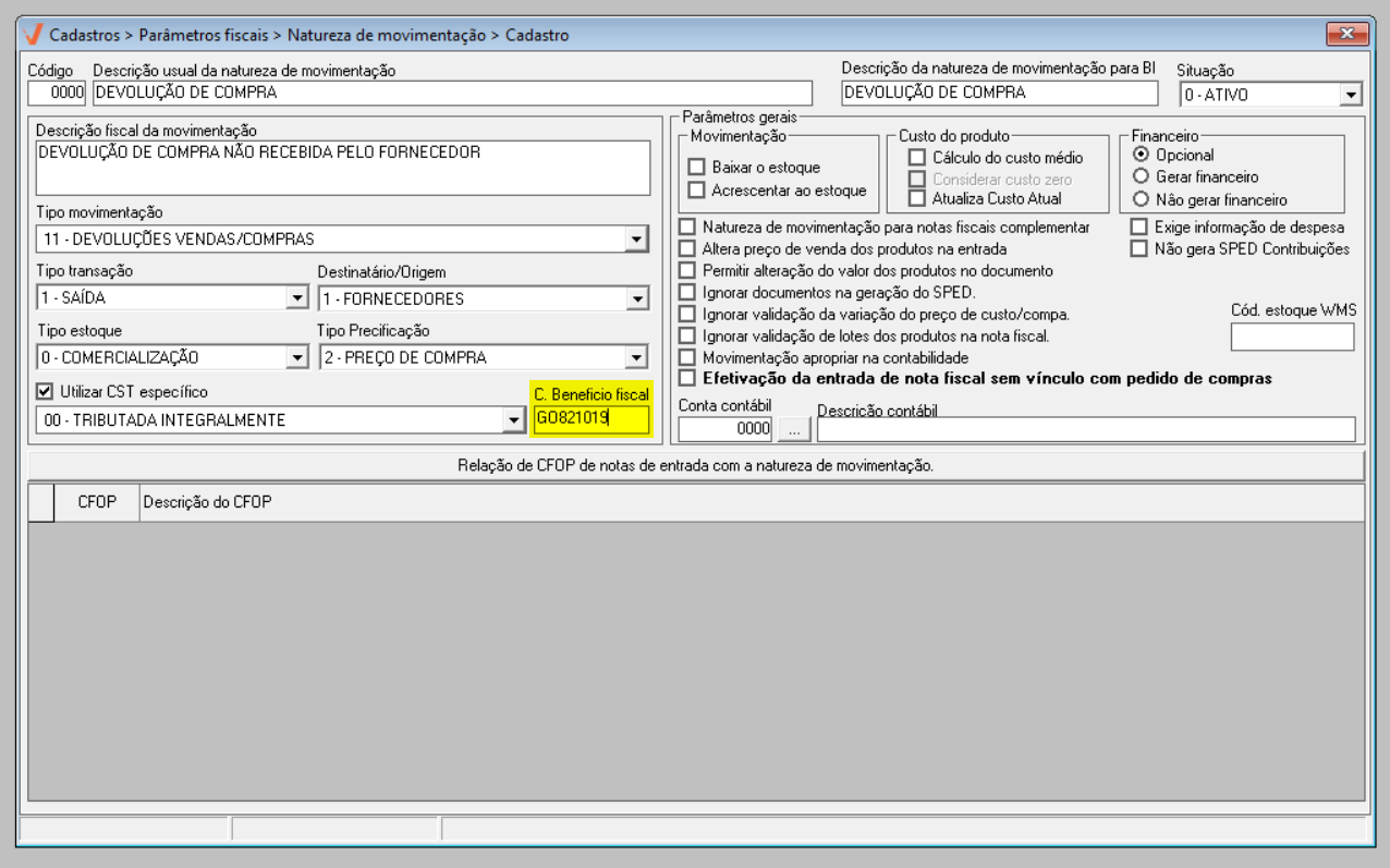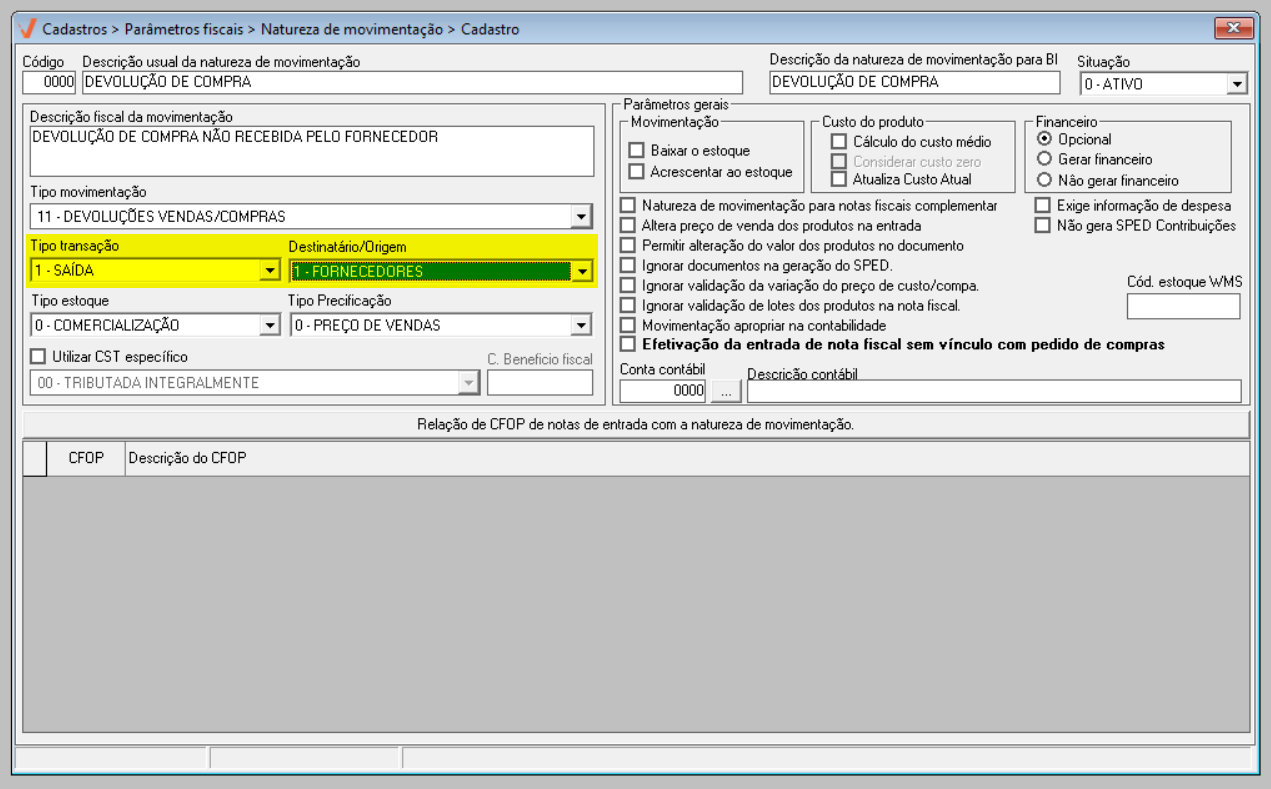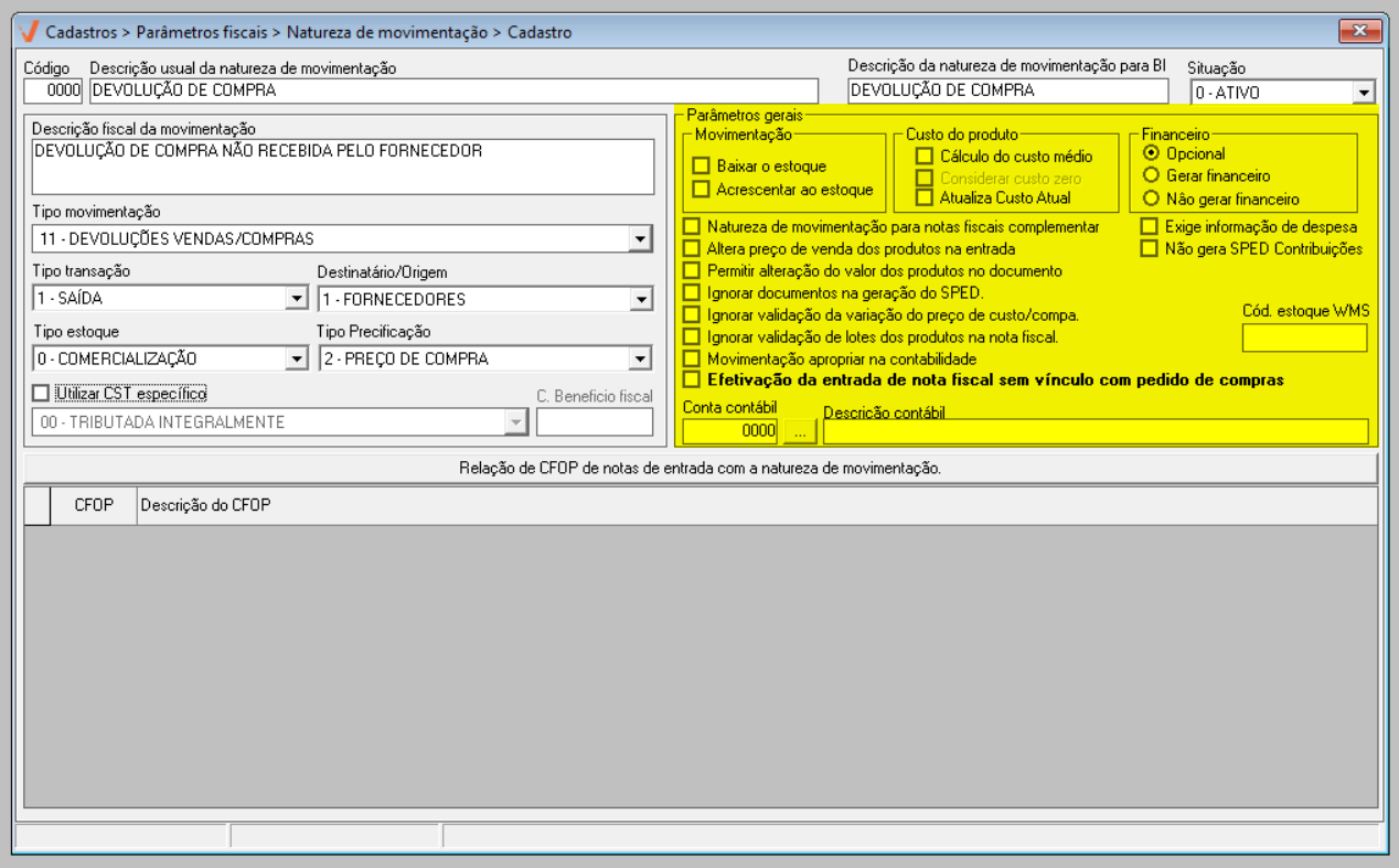 - Em seguida, o menu: Cadastros >> Parâmetros fiscais >> Natureza de movimentação >> Cadastro.