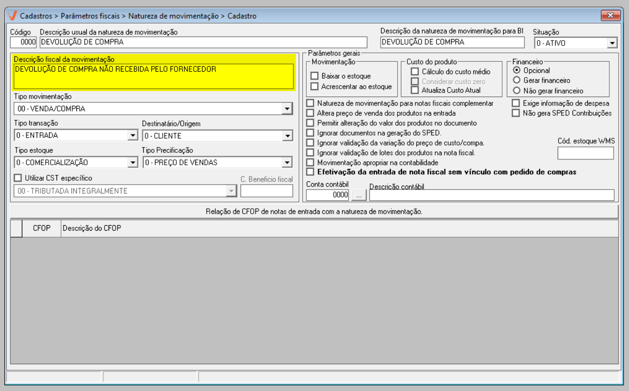 Para realizar a consulta de uma natureza de movimentação, digite no campo “Código”, o código interno do registro seguido de >> Enter. Ou, tecle o atalho F6 para realizar a consulta e seleção. Clique aqui e veja como realizar uma consulta por meio desta tela. Feito isso, o registro será detalhado na tela, confira o exemplo: