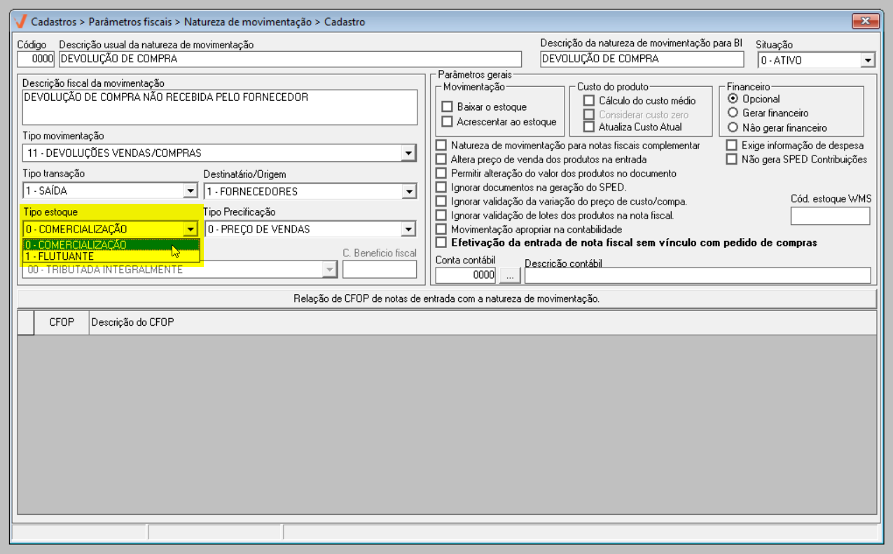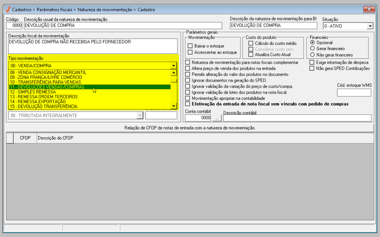 Em seguida, defina o "Tipo da movimentação" considerando que ele deverá corresponder ao que a movimentação irá realizar. Ou seja, se a natureza de operação a ser cadastrada for devolução de compra, o seu tipo será 11 - Devoluções vendas/compras.