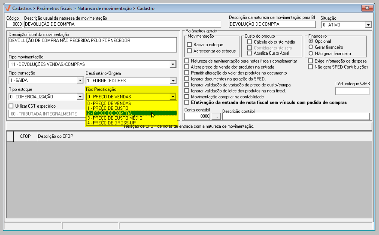 Já em "Tipo de precificação", defina qual o preço do produto que constará na nota fiscal, exemplo: 0 - Preço de Vendas; 1 - Preço de custo; 2 - Preço de compra, 3 - Preço de custo médio e 4 - Preço de Gross-UP.