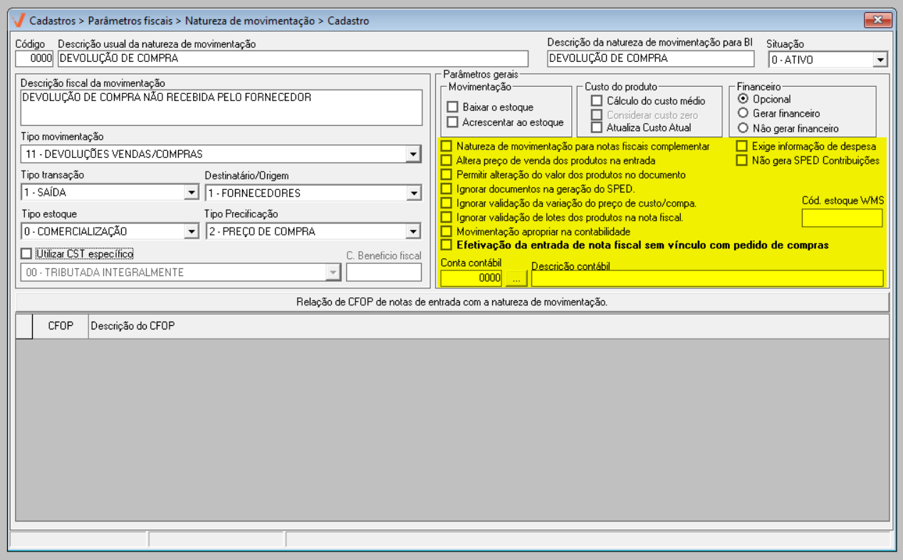 - Natureza de movimentação para notas fiscais complementares: O usuário deverá marcar esta opção quando se tratar de uma Natureza de Operação para uma Nota fiscal complementar.