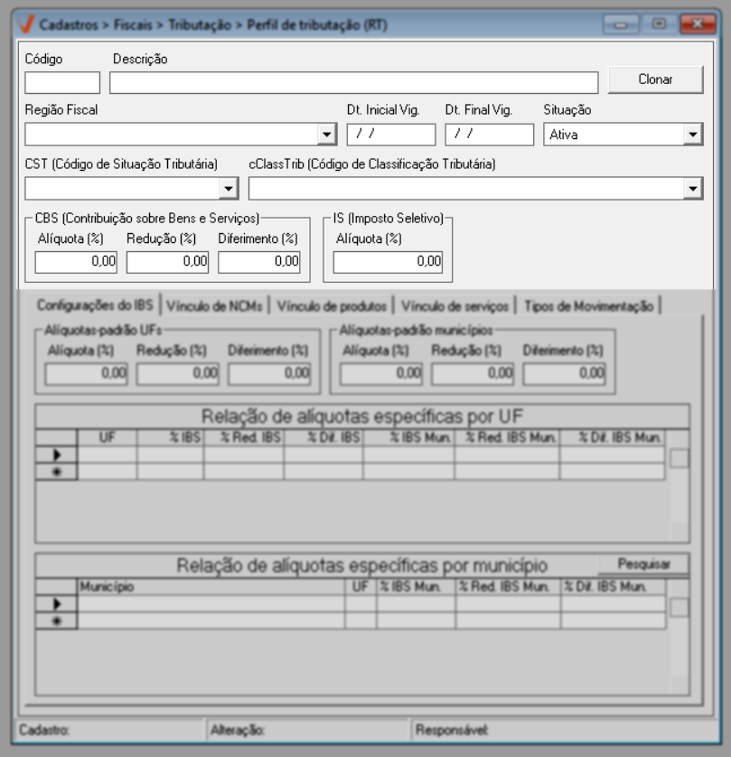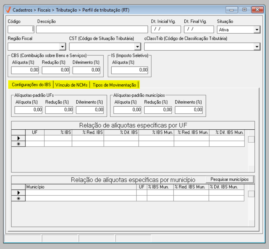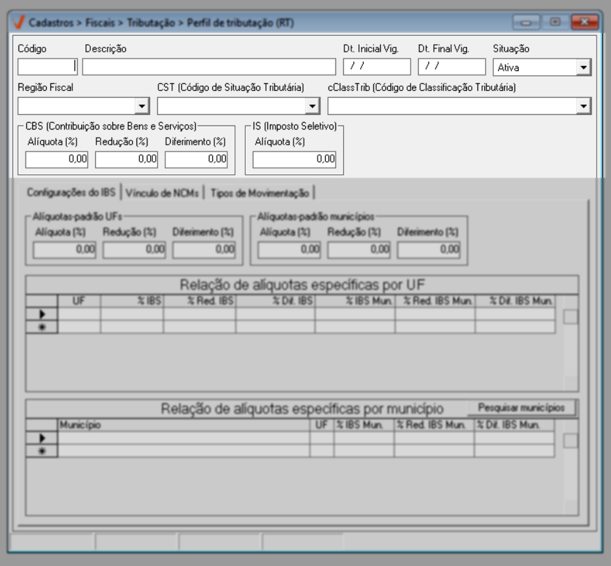 A tela "Perfis de Tributação (RT)" foi desenvolvida para a configuração das alíquotas e regras dos novos tributos IBS - Imposto sobre Bens e Serviços e CBS - Contribuição sobre Bens e Serviços, instituídos pela Reforma Tributária, conforme a Emenda Constitucional nº 132/2023. O IBS substituirá tributos de competência Estadual e Municipal, unificando a arrecadação sobre o consumo nessas esferas, enquanto a CBS concentrará a tributação de competência Federal, também incidente sobre bens e serviços. Ambos os impostos integram o novo modelo de tributação sobre o consumo adotado no país. A reforma prevê um período de transição gradual entre 2026 e 2033, no qual o sistema tributário atual coexistirá com o novo modelo, até a substituição definitiva dos tributos antigos pelos novos impostos. Dessa forma, a tela "Perfis de Tributação (RT)" tem como objetivo proporcionar a configuração dos perfis de tributação, a fim de assegurar a conformidade fiscal na emissão de NF-e e NFC-e a partir de 01/01/2026, atendendo às exigências legais estabelecidas pela nova legislação.
