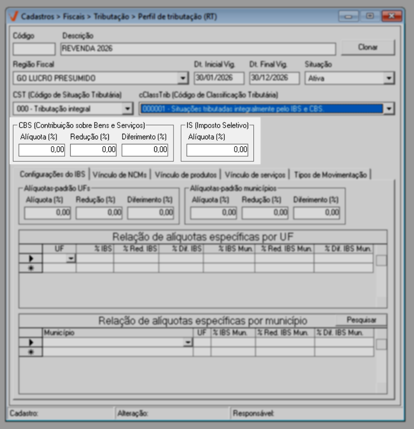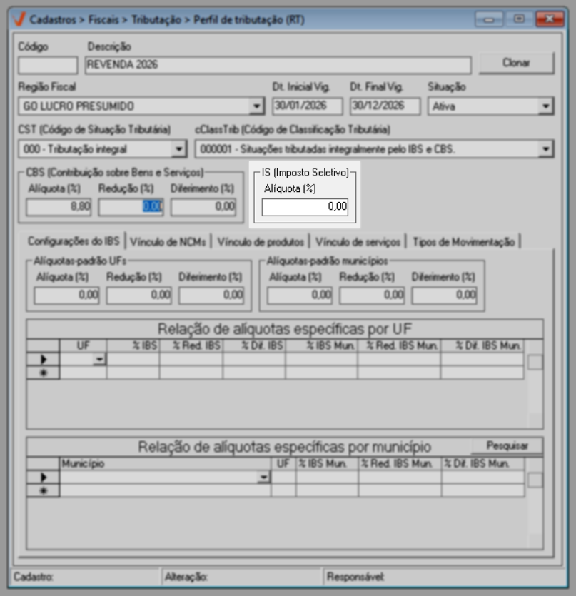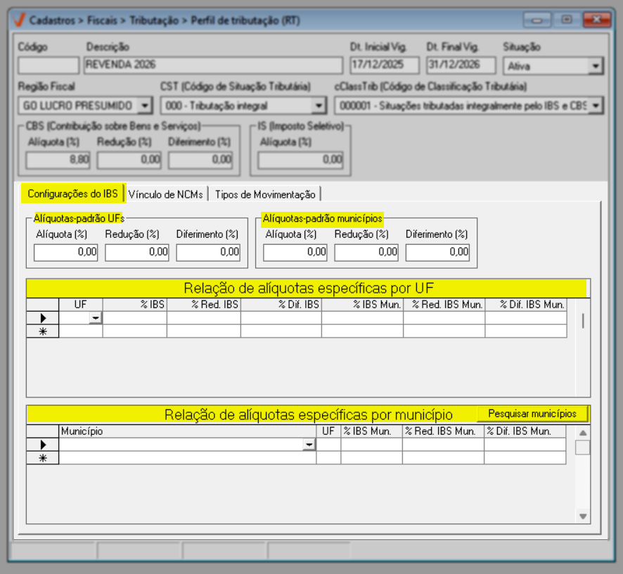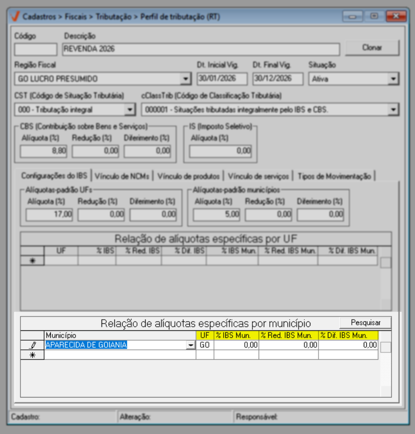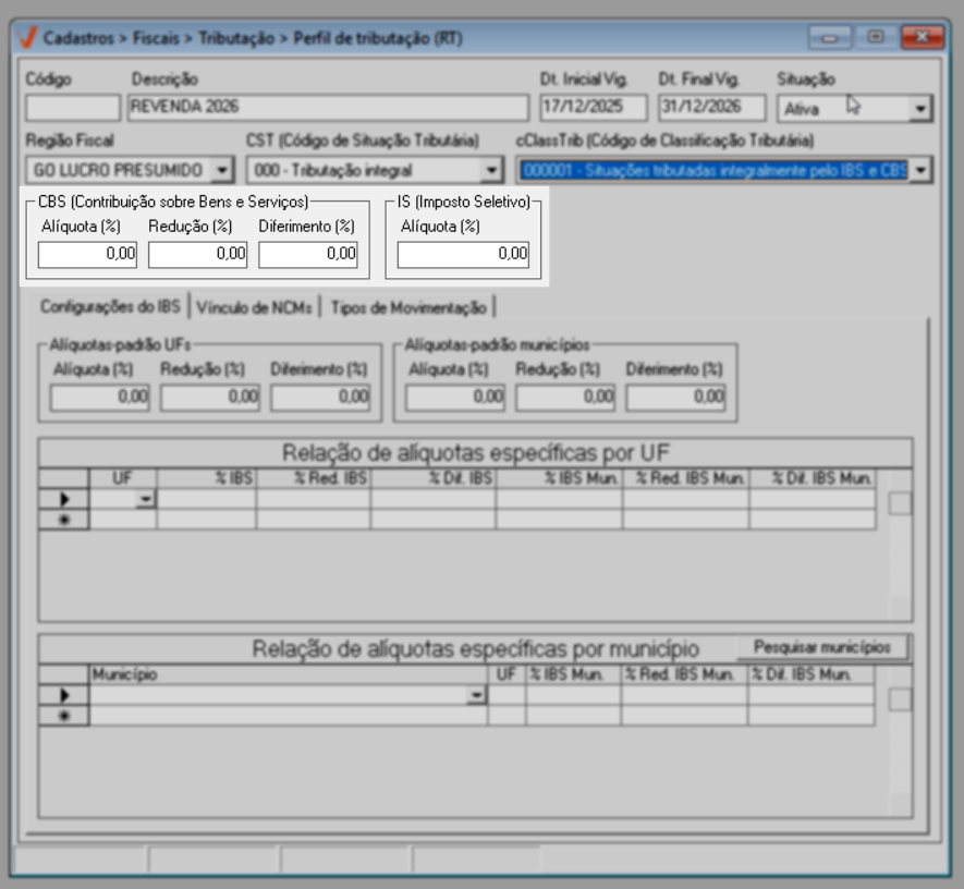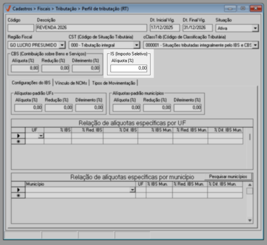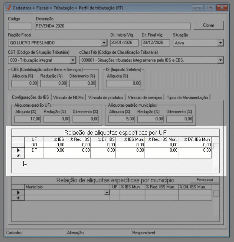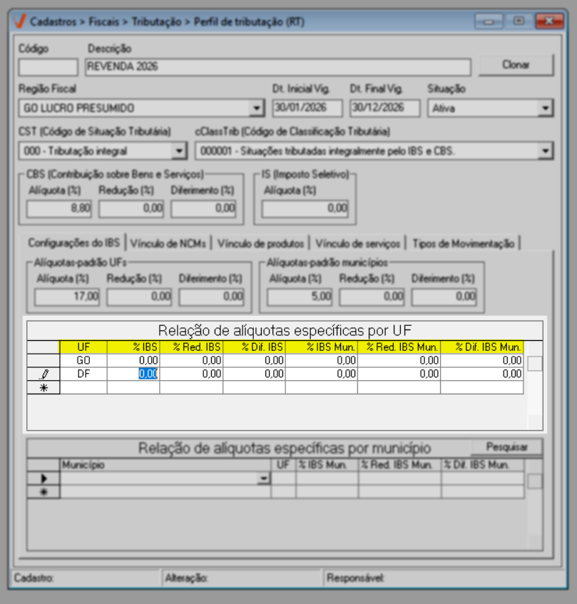 Para o ano de 2026, aplica-se a regra geral de tributação. Já a partir de 2027, caso existam exceções definidas por estado ou município, elas poderão ser configuradas diretamente nesta mesma tela, por meio das seções de “Alíquotas específicas por UF” e “Alíquotas específicas por Município”, conforme previsto na legislação.