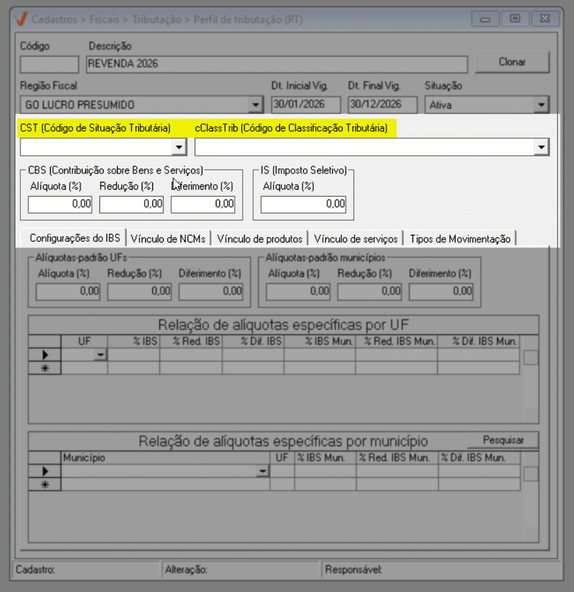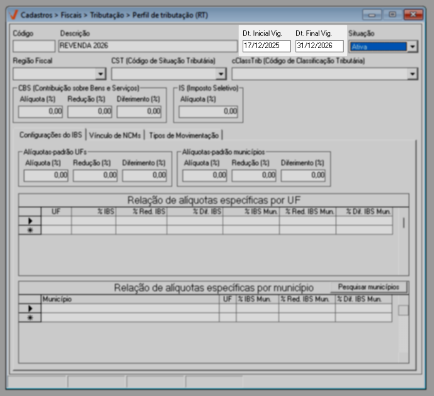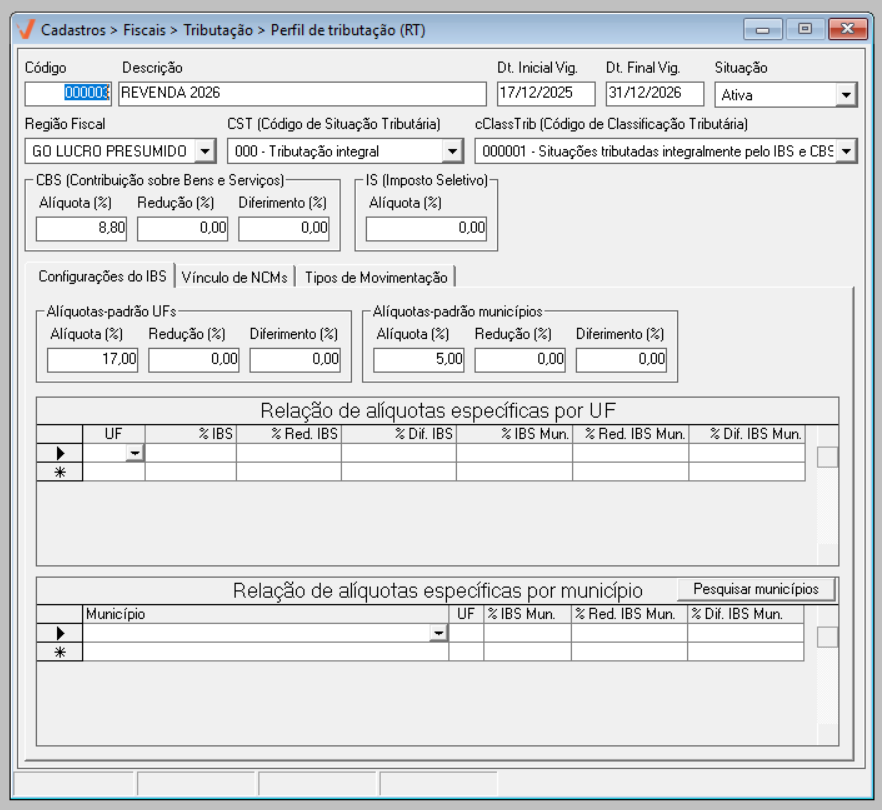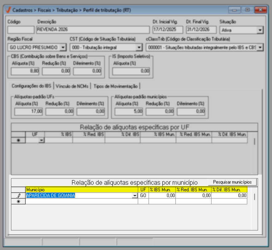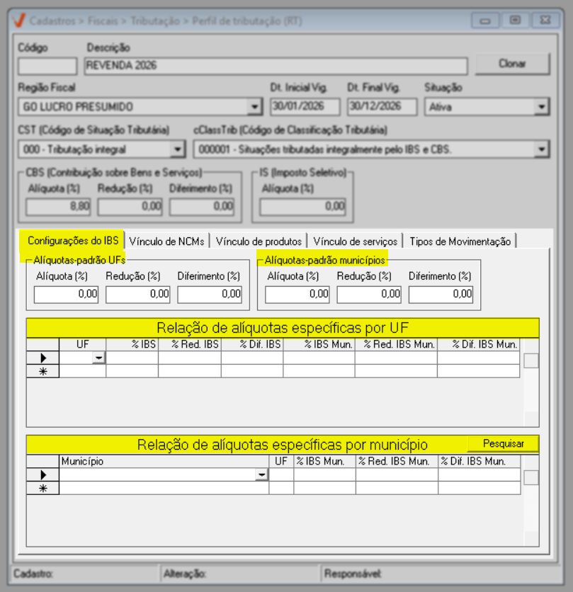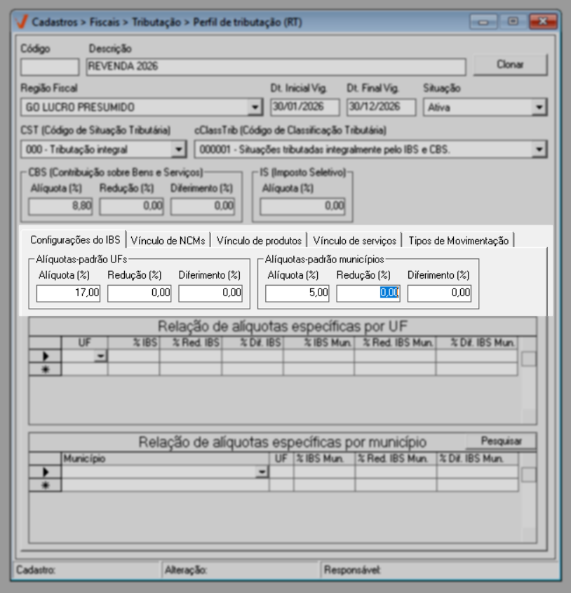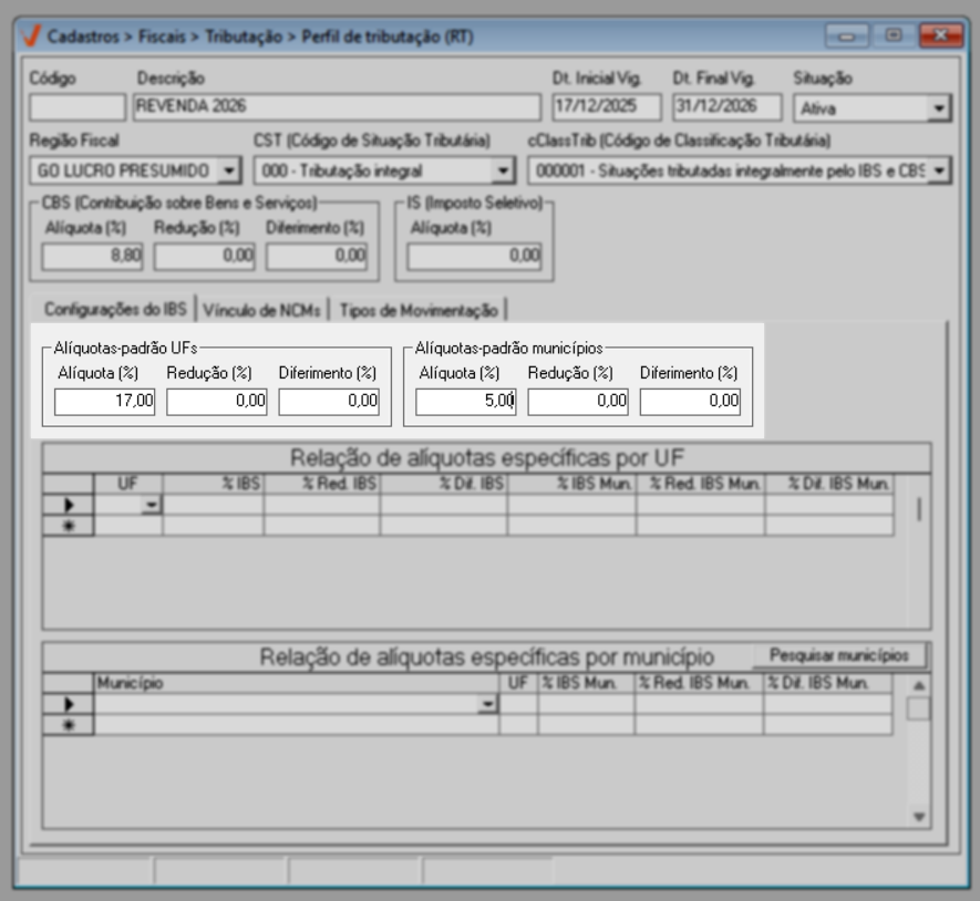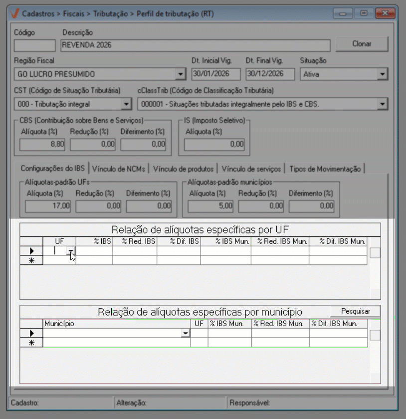 Para o ano de 2026, aplica-se a regra geral de tributação. Já a partir de 2027, caso existam exceções definidas por estado ou município, elas poderão ser configuradas diretamente nesta mesma tela, por meio das seções de “Alíquotas específicas por UF” e “Alíquotas específicas por Município”, conforme previsto na legislação.