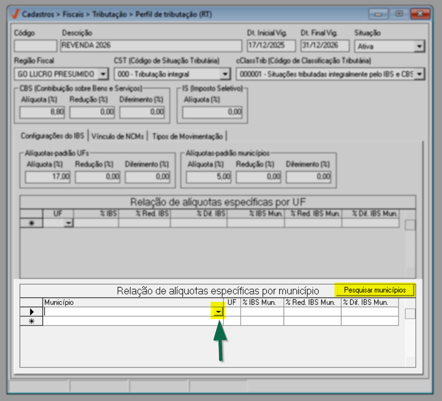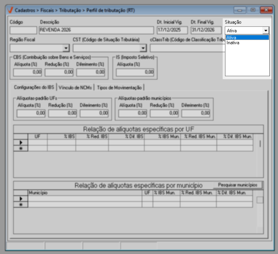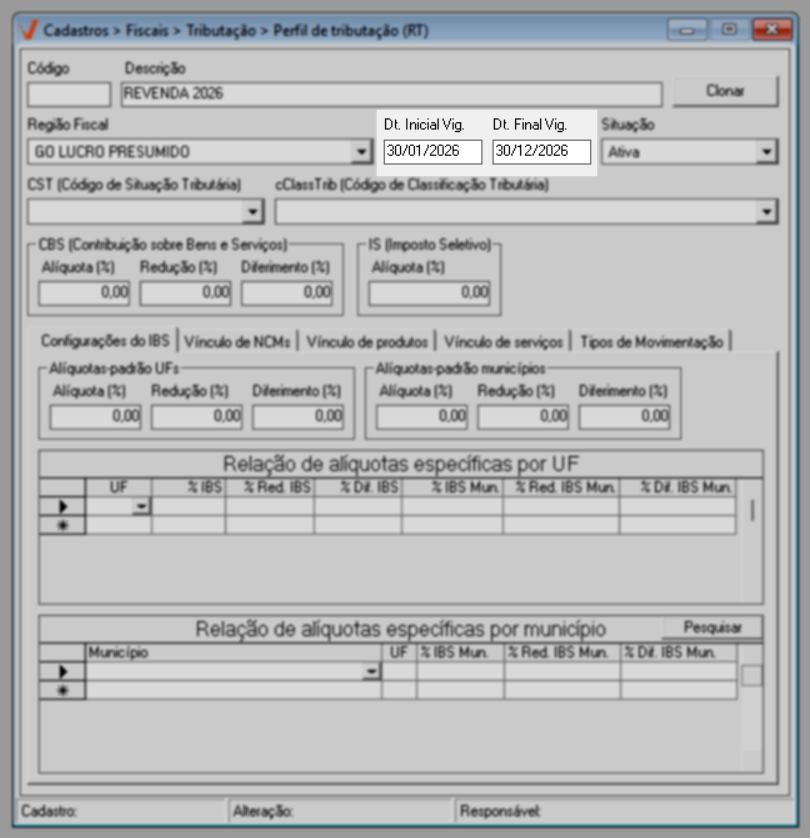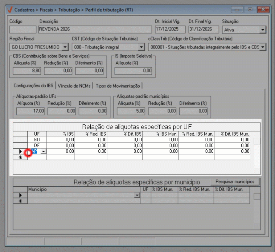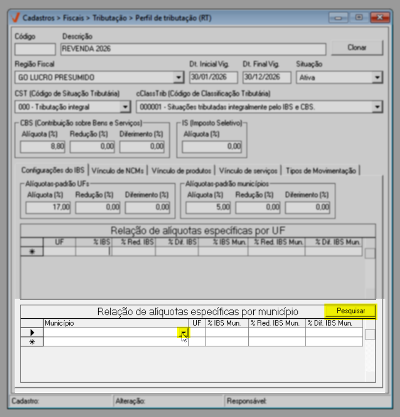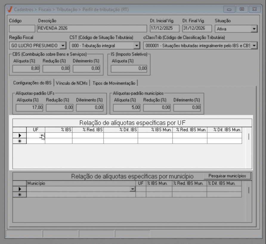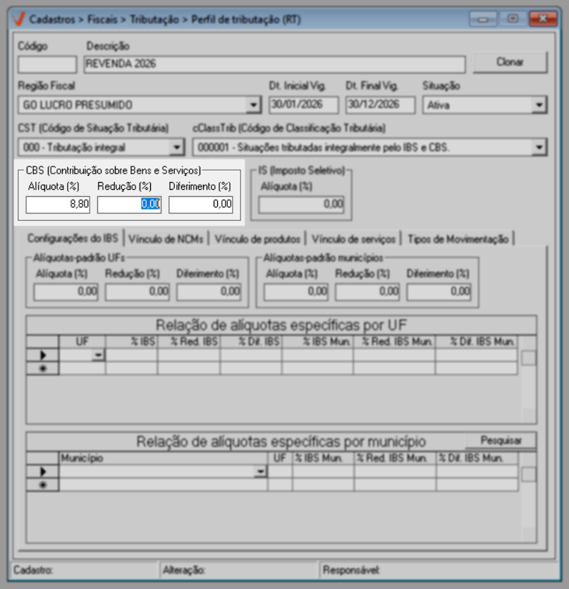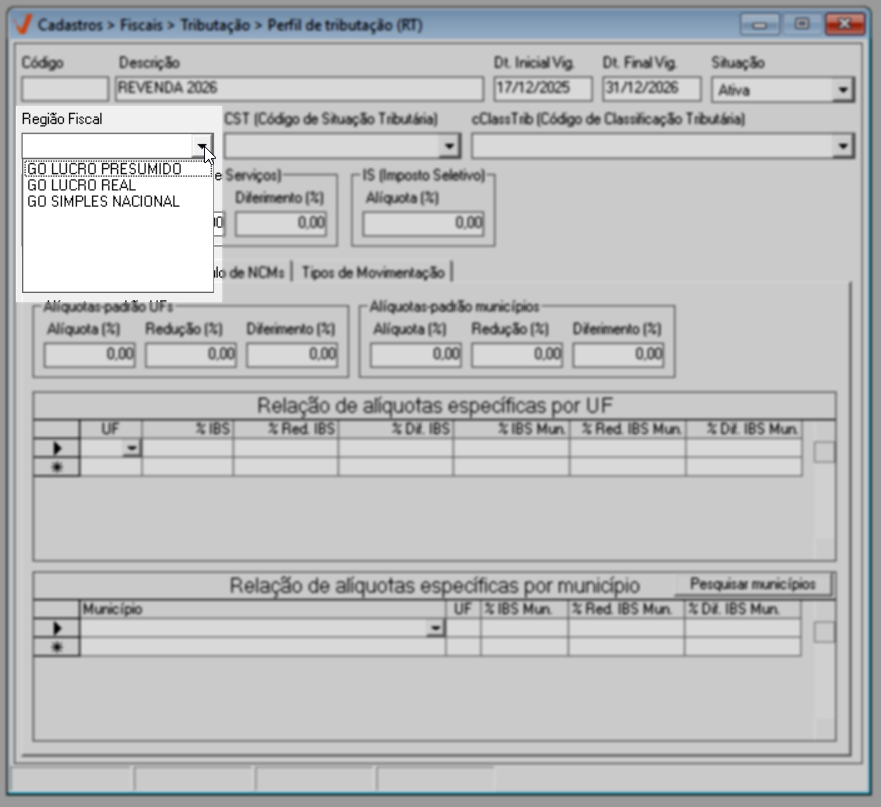 Para o ano de 2026, aplica-se a regra geral de tributação. Já a partir de 2027, caso existam exceções definidas por estado ou município, elas poderão ser configuradas diretamente nesta mesma tela, por meio das seções de “Alíquotas específicas por UF” e “Alíquotas específicas por Município”, conforme previsto na legislação.