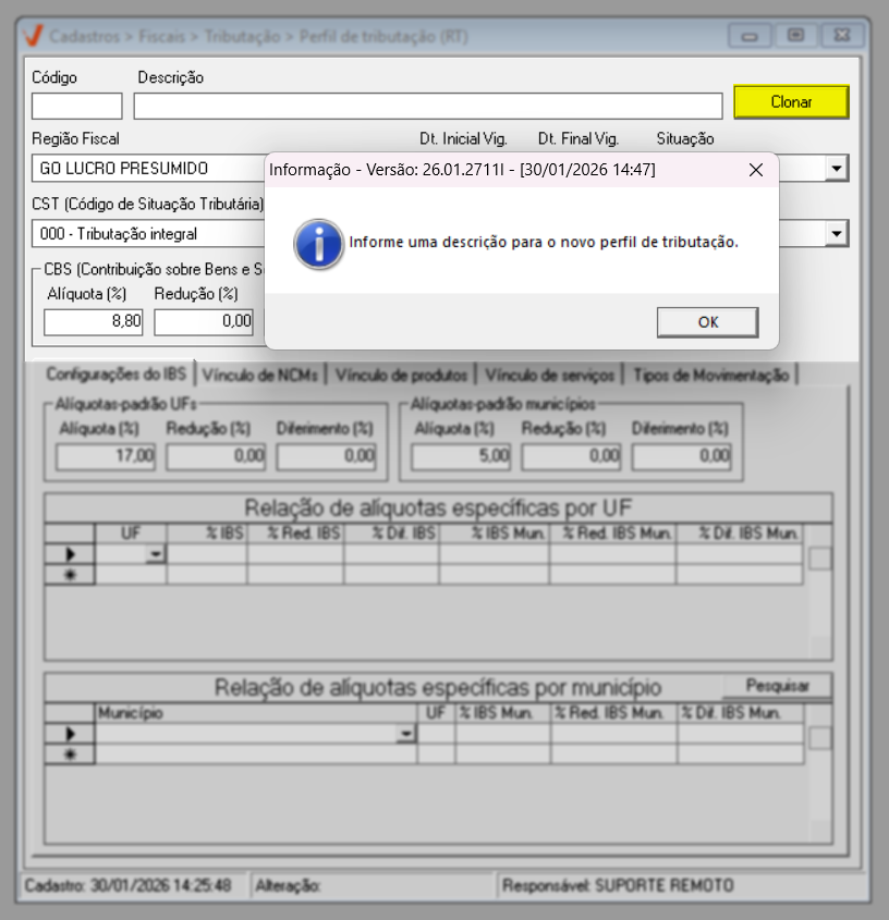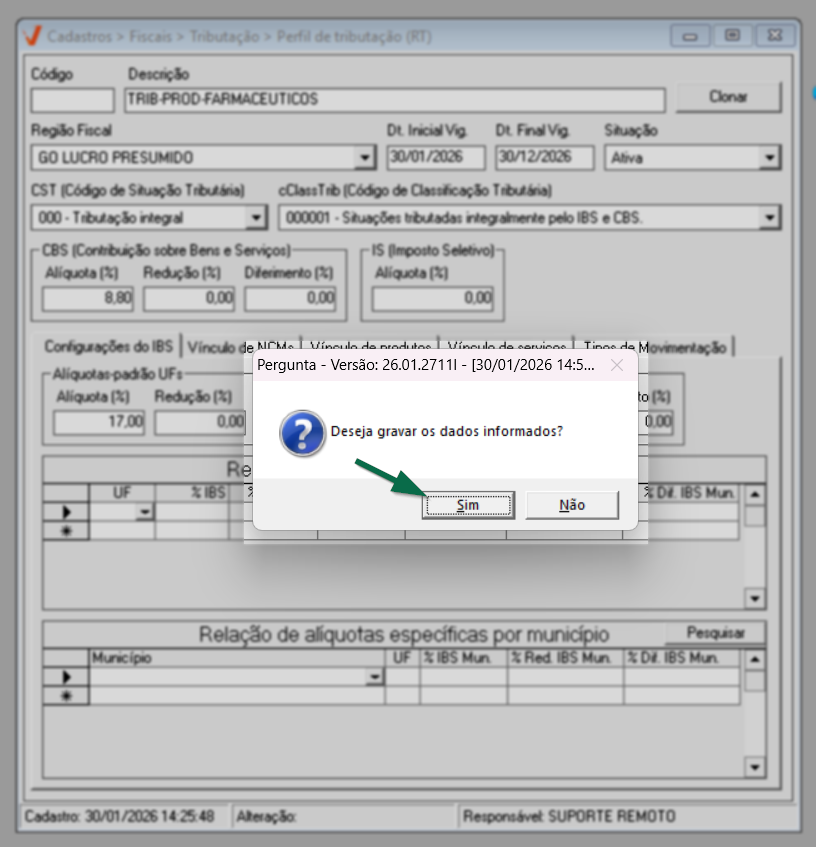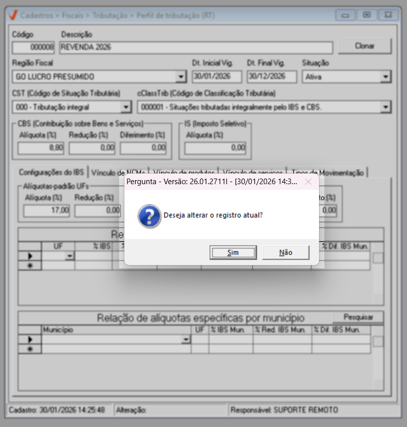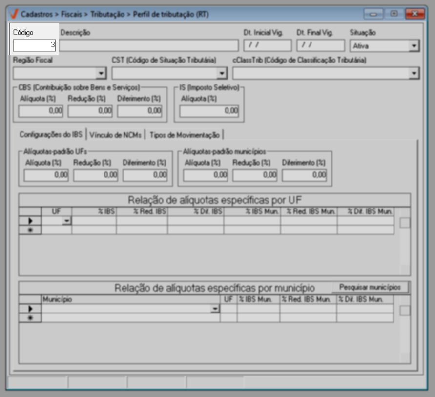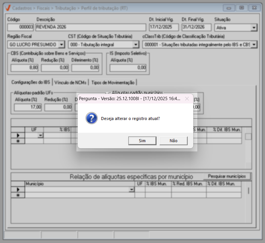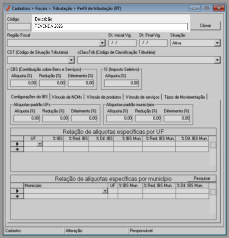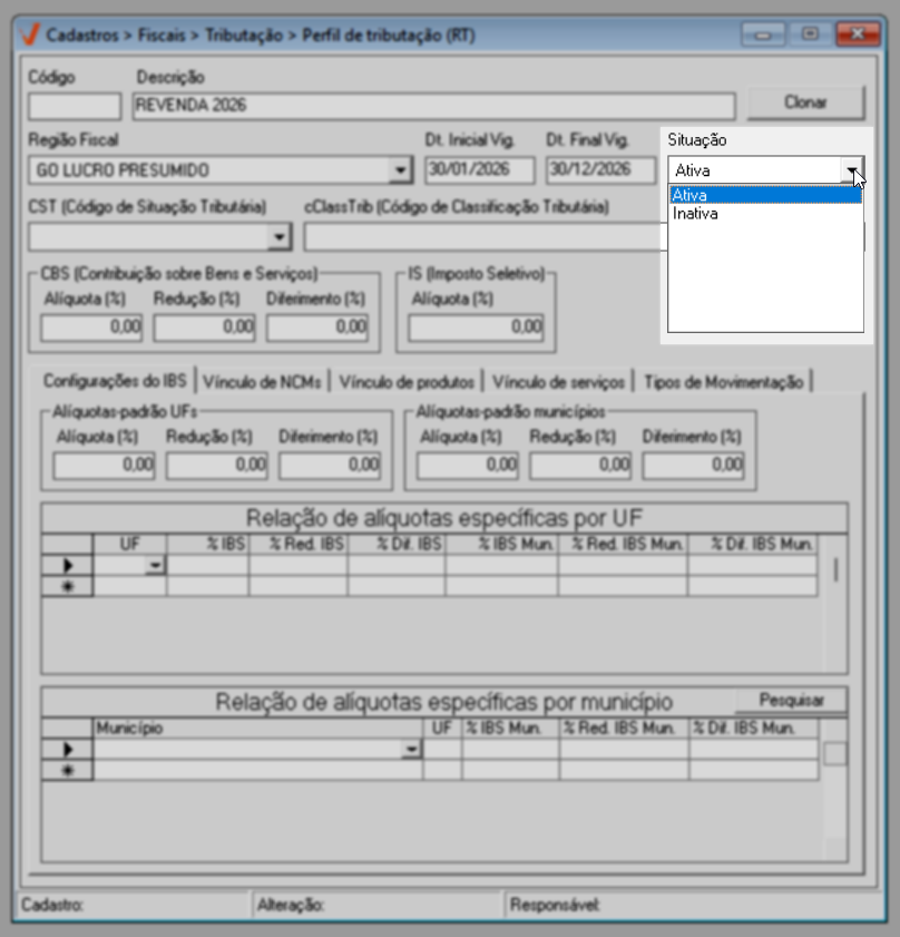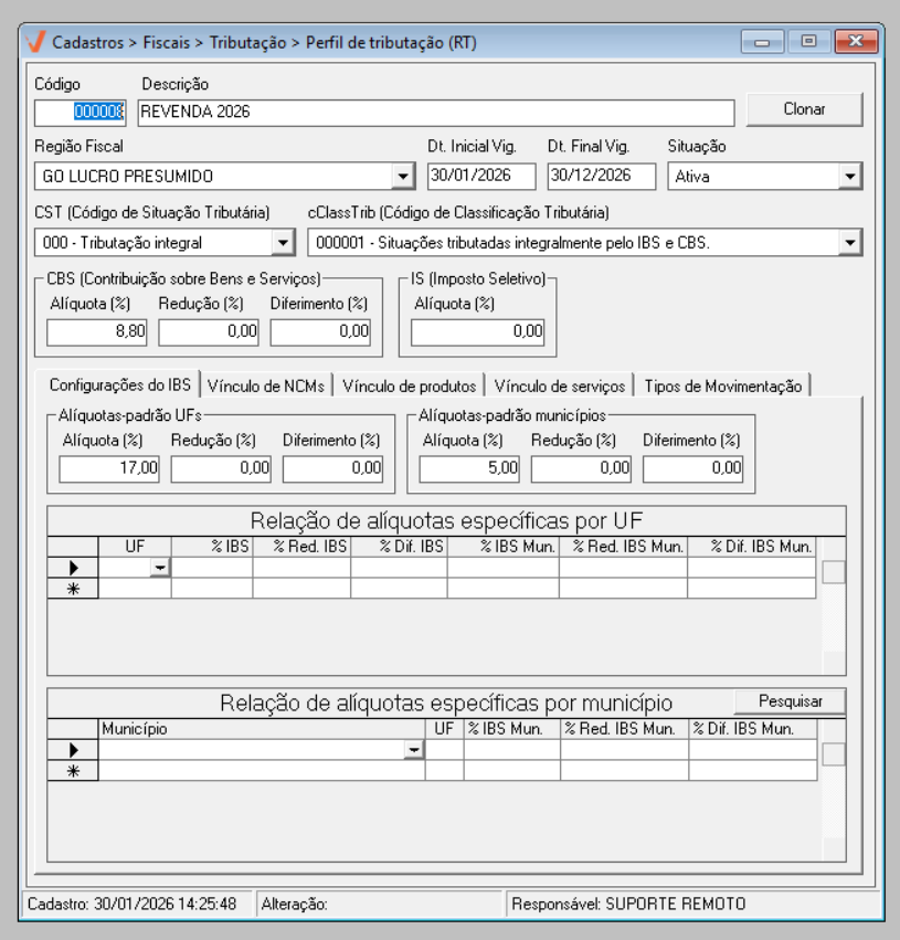 Para o ano de 2026, aplica-se a regra geral de tributação. Já a partir de 2027, caso existam exceções definidas por estado ou município, elas poderão ser configuradas diretamente nesta mesma tela, por meio das seções de “Alíquotas específicas por UF” e “Alíquotas específicas por Município”, conforme previsto na legislação.