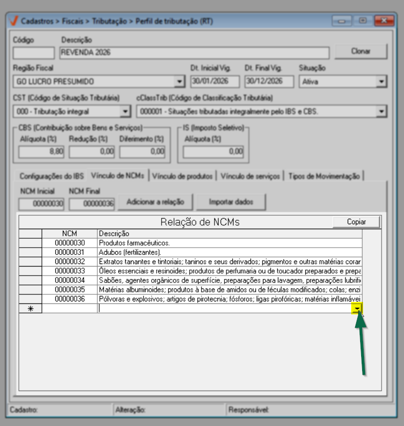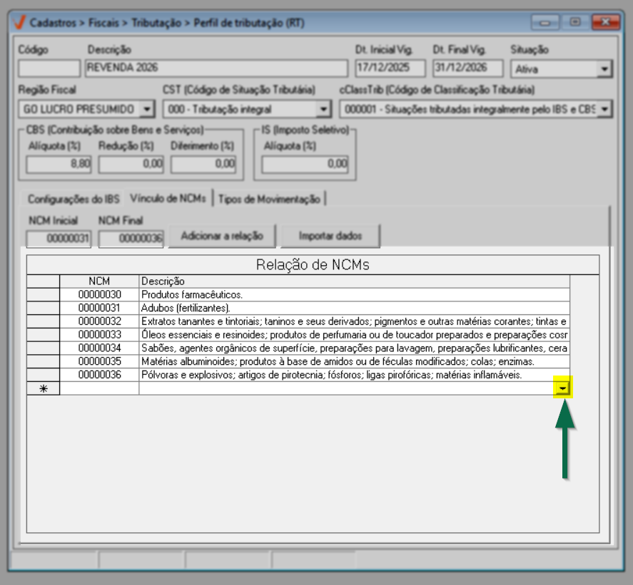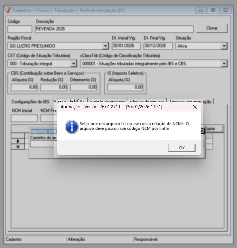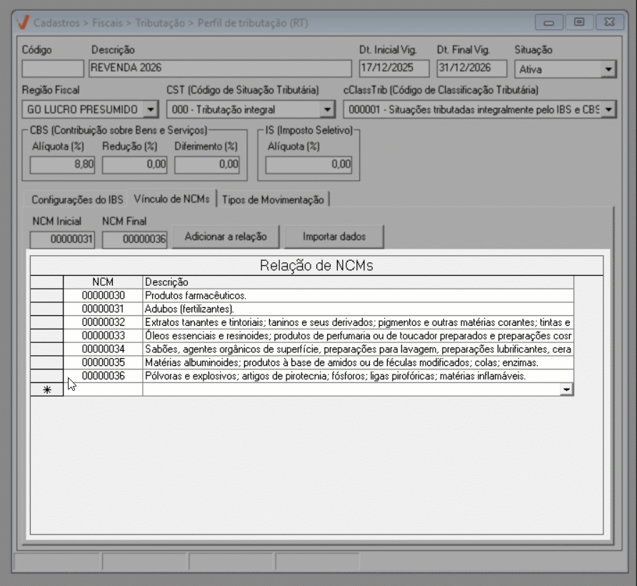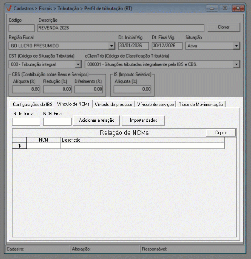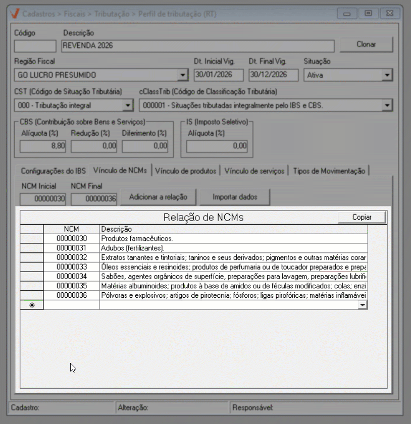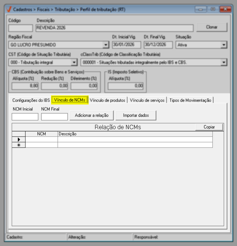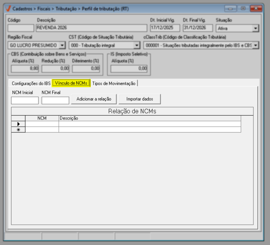 Após concluir a configuração do IBS, prossiga para a aba "Vínculo de NCM".