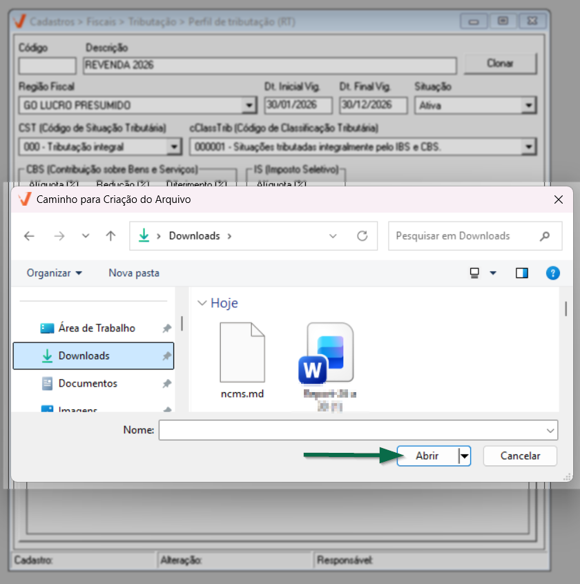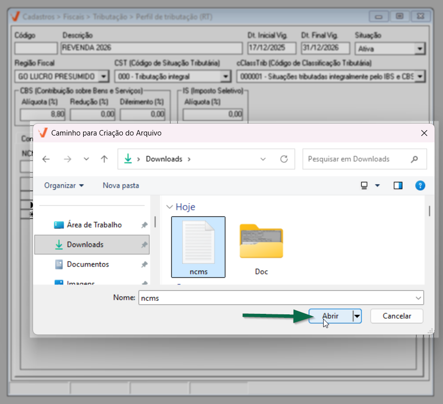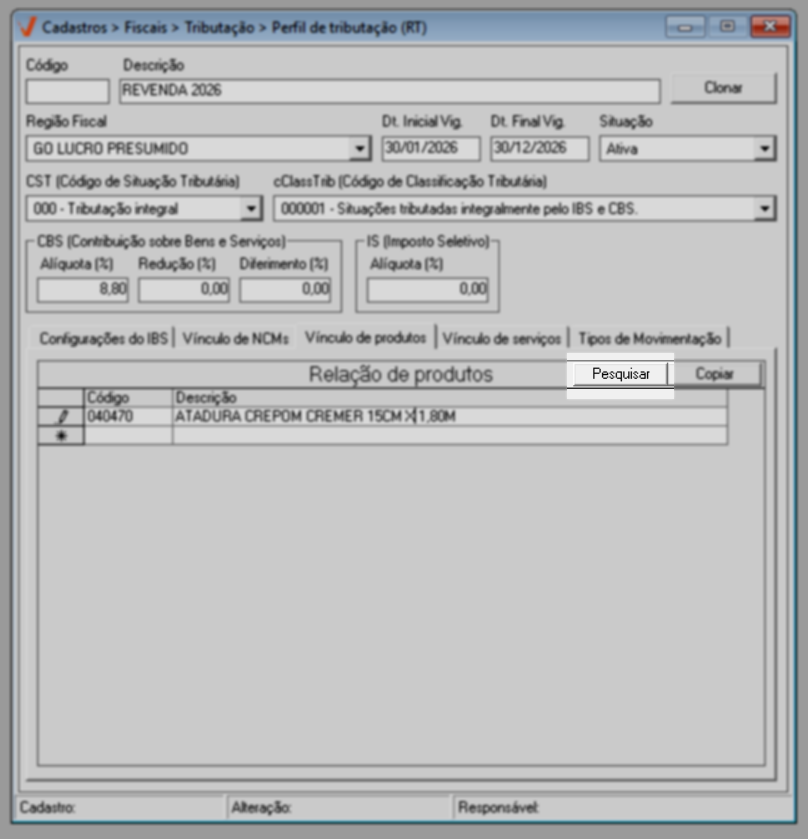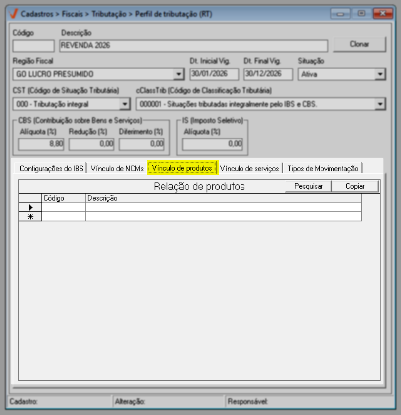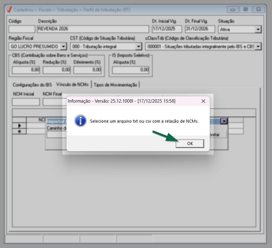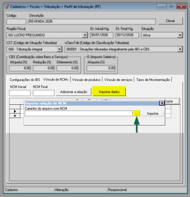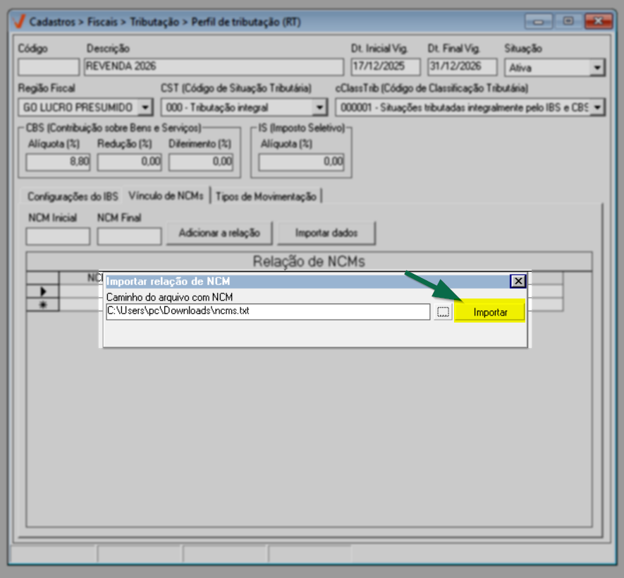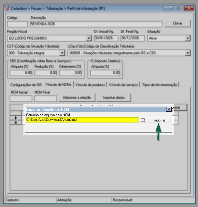 Após concluir a configuração do IBS, prossiga para a aba "Vínculo de NCM".