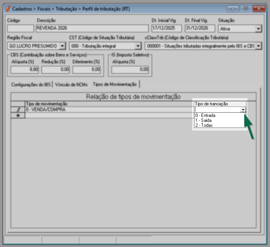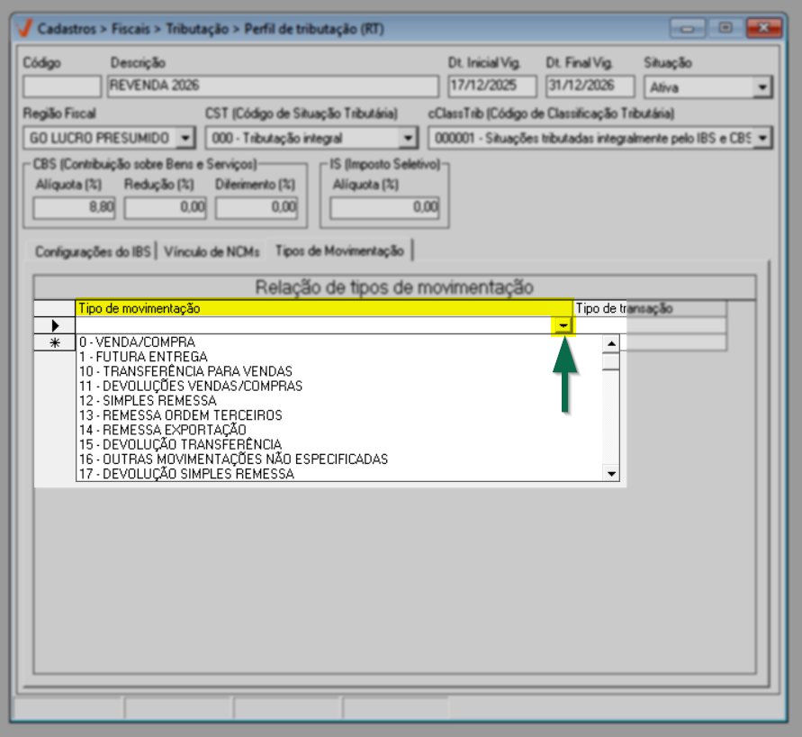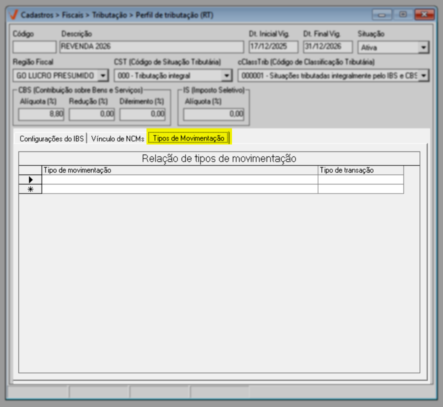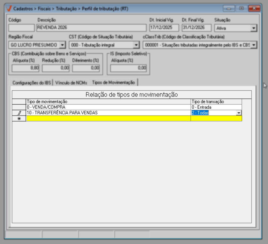 Após configurar os NCMs, acesse a aba "Tipos de Movimentação". Nessa etapa, o usuário define em quais operações fiscais o perfil tributário será aplicado, ou seja, quando o imposto será efetivamente calculado pelo sistema. O objetivo dessa configuração é vincular o perfil a operações fiscais internas específicas, garantindo que as regras tributárias sejam acionadas apenas nos cenários corretos.