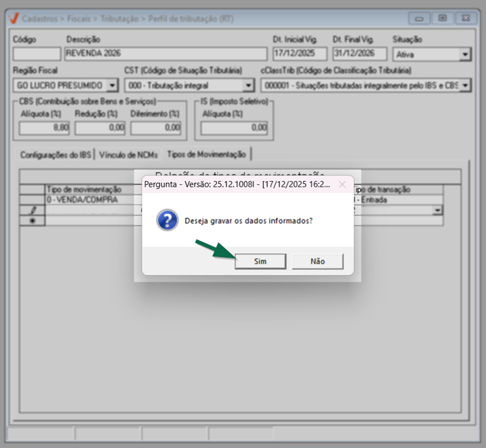 Nessa seção, o usuário pode incluir quantas operações forem necessárias. Ao preencher a última linha da lista, uma nova será automaticamente exibida, permitindo a continuidade do cadastro. Essa configuração funciona como um gatilho de aplicação do perfil tributário, determinando exatamente em quais tipos de movimentação o sistema deverá aplicar as regras de IBS e CBS durante a emissão dos documentos fiscais.