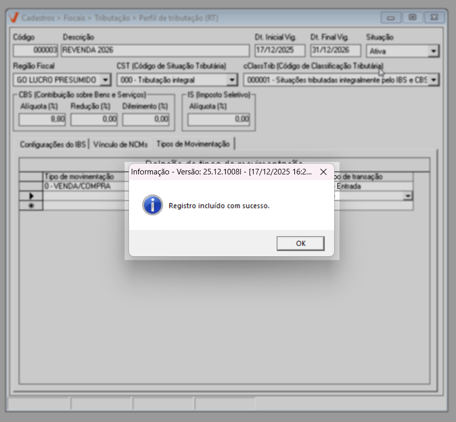 Ao confirmar a gravação do registro, o sistema exibirá uma mensagem de sucesso. Após a confirmação dessa mensagem, a tela será automaticamente limpa, ficando pronta para o cadastro de um novo perfil. Dessa forma, essa configuração passará a compor a estrutura do arquivo XML dos documentos cuja emissão de nota é realizada conforme a legislação vigente.