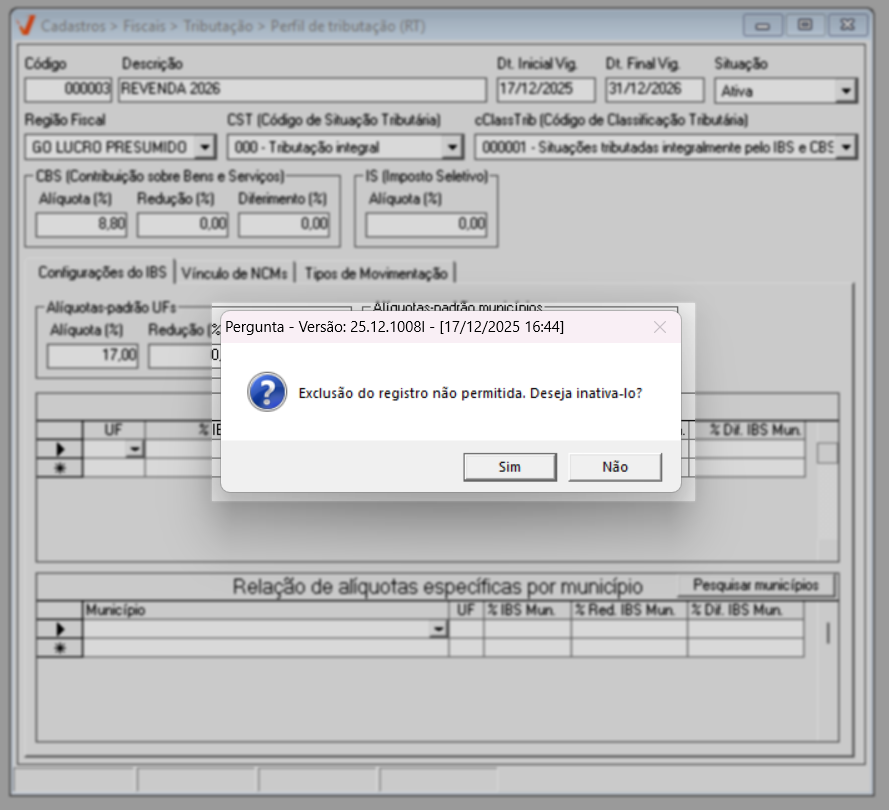 É importante destacar que, caso o usuário tenha interesse de desconsiderar um perfil cadastrado, a sua exclusão não será permitida pelo sistema. Essa restrição existe para preservar a integridade histórica das informações fiscais, uma vez que os perfis podem estar vinculados a documentos já emitidos. Como alternativa à exclusão, recomenda-se alterar a situação do perfil para “Inativo”, impedindo sua utilização em novas emissões, sem comprometer os registros fiscais já existentes. Caso o usuário utilize o atalho >> F5, responsável pela funcionalidade de exclusão, o sistema exibirá uma mensagem de alerta informando que a operação não é permitida, sugerindo a inativação, como medida. Veja um exemplo: