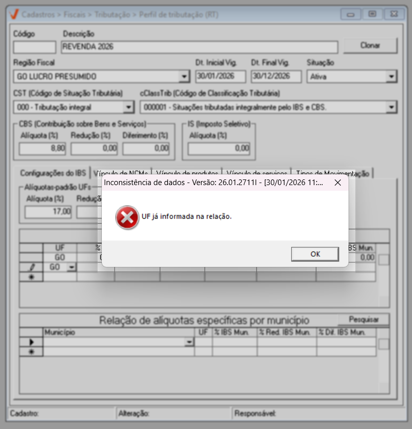 Não é permitido cadastrar a mesma UF mais de uma vez nessa lista. Cada estado pode possuir apenas um conjunto de regras específicas, garantindo a consistência e a correta aplicação das alíquotas. Se uma UF já informada for mais uma vez inserida, um alerta impedindo a ação será exibido na tela.