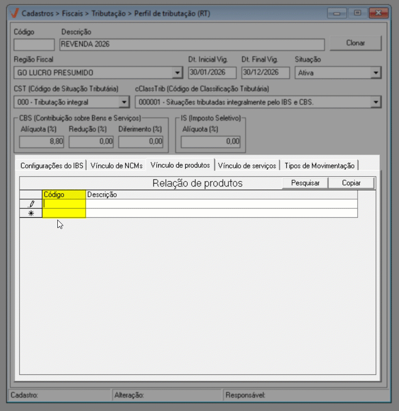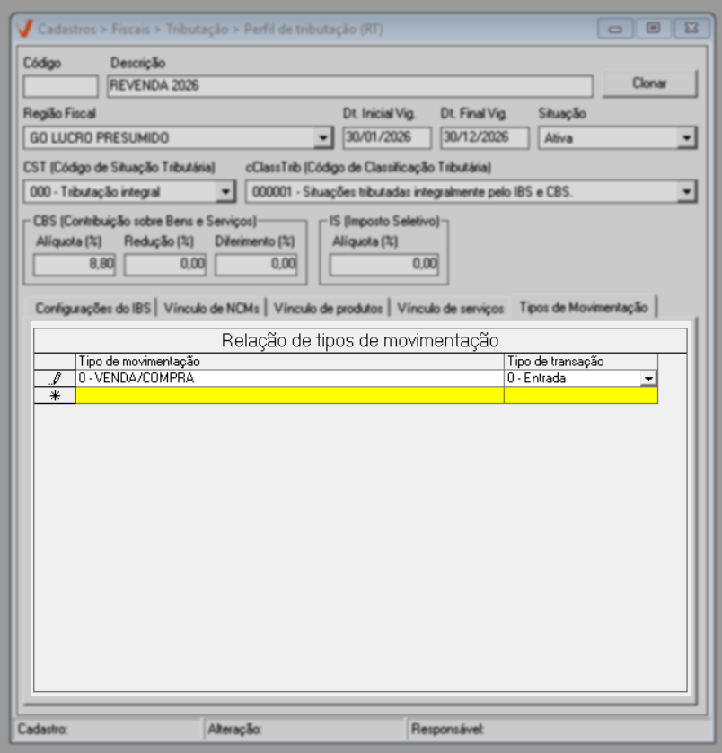 Assim como nas abas anteriores, o usuário pode incluir quantas operações forem necessárias na aba "Tipo de movimentação". Ao preencher a última linha da lista, uma nova será automaticamente exibida, permitindo a continuidade do cadastro. Essa configuração funciona como um gatilho de aplicação do perfil tributário, determinando exatamente em quais tipos de movimentação o sistema deverá aplicar as regras de IBS e CBS durante a emissão dos documentos fiscais.