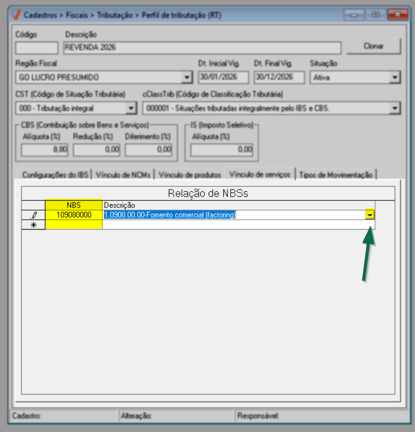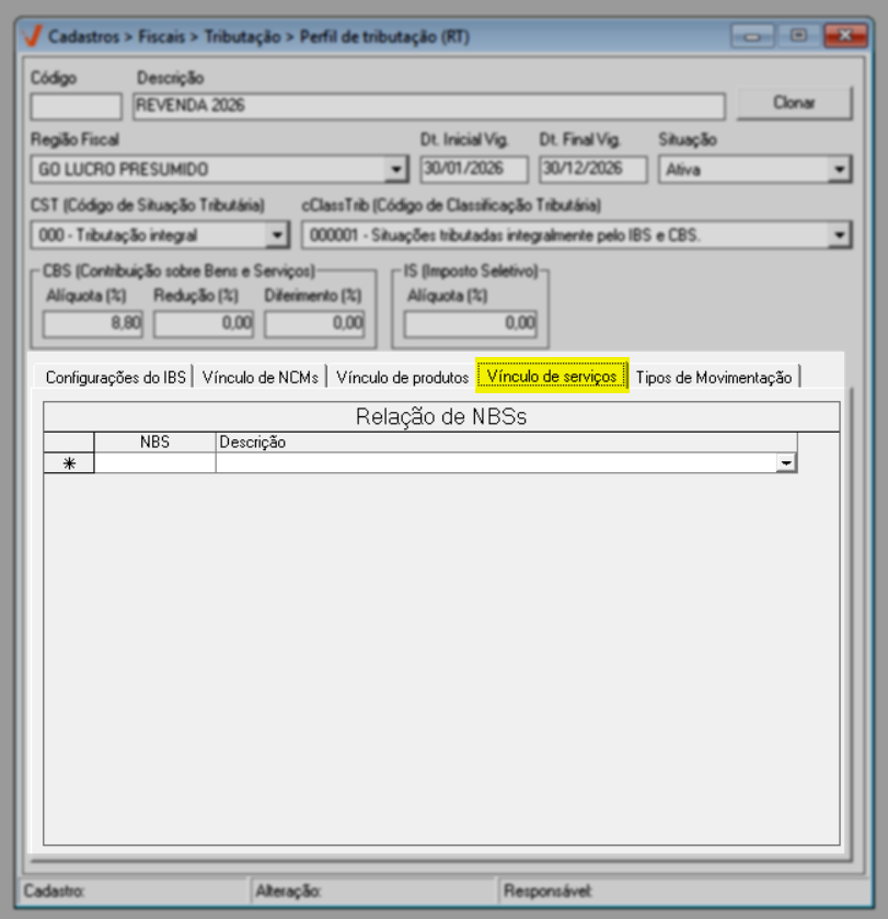 A aba “Vínculo de Serviços” permite incluir a relação de NBSs (Nomenclatura Brasileira de Serviços), associando-os ao perfil tributário. Dessa forma, as regras fiscais configuradas no perfil serão aplicadas automaticamente aos serviços cadastrados que correspondam aos NBSs incluídos, garantindo consistência e conformidade na tributação dos serviços prestados.