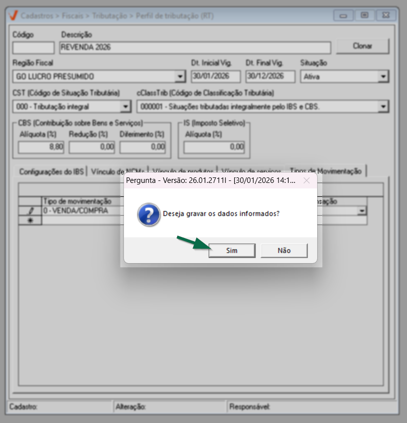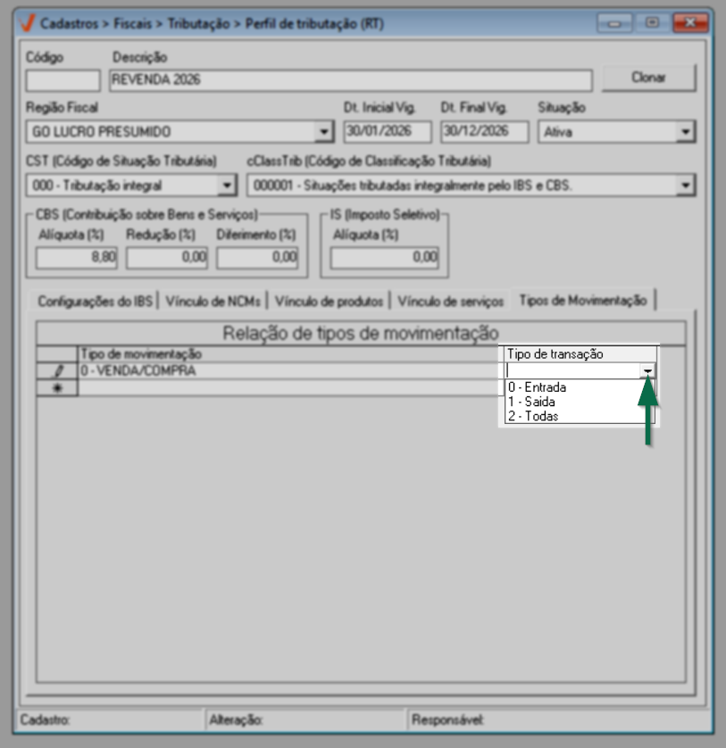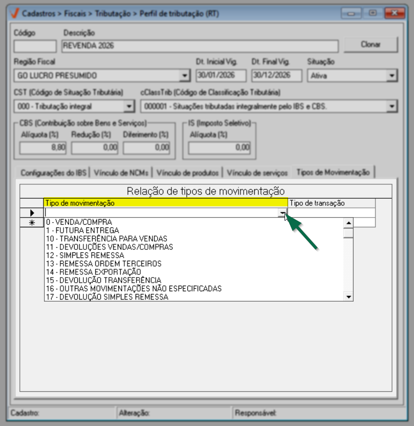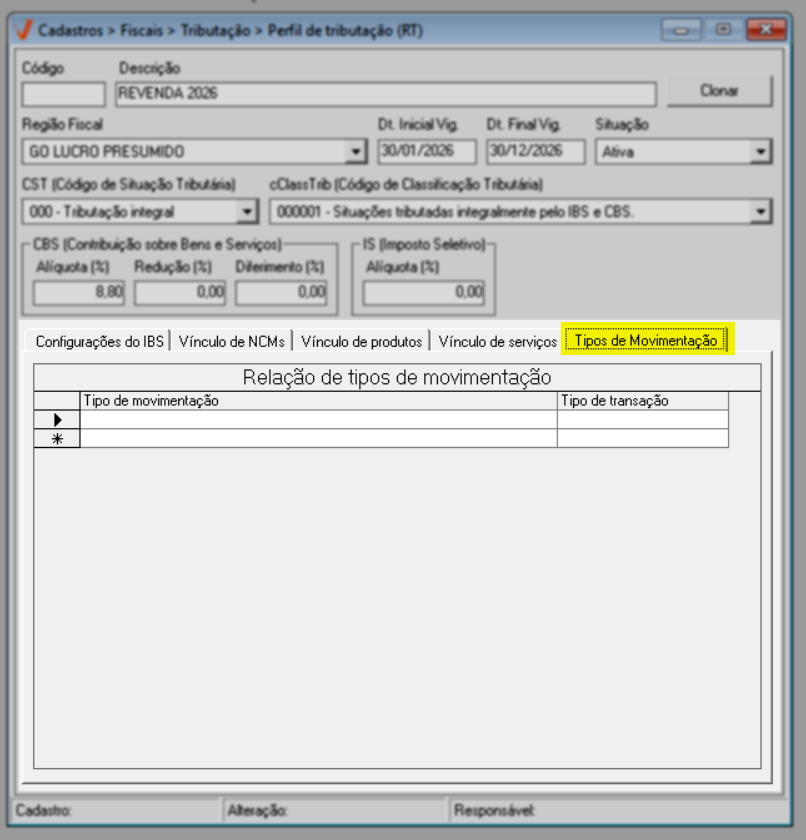 Para concluir o cadastro do perfil de tributação, clique na aba "Tipo de movimentação" e confira as orientações a seguir para configurá-la.