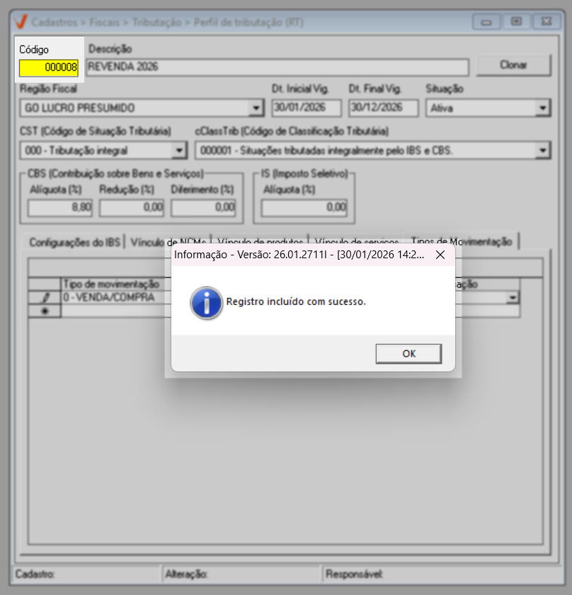 Ao confirmar a gravação do registro, o sistema exibirá uma mensagem de sucesso e apresentará no campo "Código" o número gerado para o cadastro. Esse código poderá ser utilizado para consultas e identificação do registro. Após a confirmação dessa mensagem, a tela será automaticamente limpa, ficando pronta para o cadastro de um novo perfil. Dessa forma, essa configuração passará a compor a estrutura do arquivo XML dos documentos cuja emissão de nota é realizada conforme a legislação vigente.