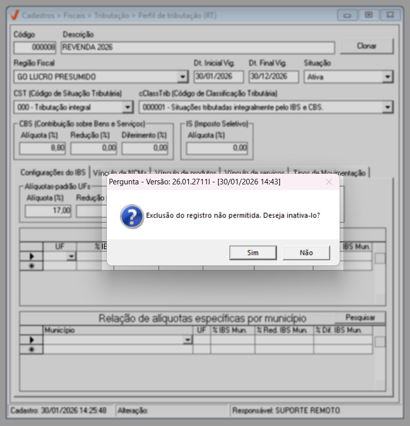 Após consultar o cadastro de um perfil de tributação, o usuário pode realizar alterações, ou utilizar os dados do cadastro como referência para a criação de um novo. No entanto, é importante destacar que, caso o usuário tenha interesse de desconsiderar um perfil cadastrado, a sua exclusão não será permitida pelo sistema. Essa restrição existe para preservar a integridade histórica das informações fiscais, uma vez que os perfis podem estar vinculados a documentos já emitidos. Como alternativa à exclusão, recomenda-se alterar a situação do perfil para “Inativo”, impedindo sua utilização em novas emissões, sem comprometer os registros fiscais já existentes.
