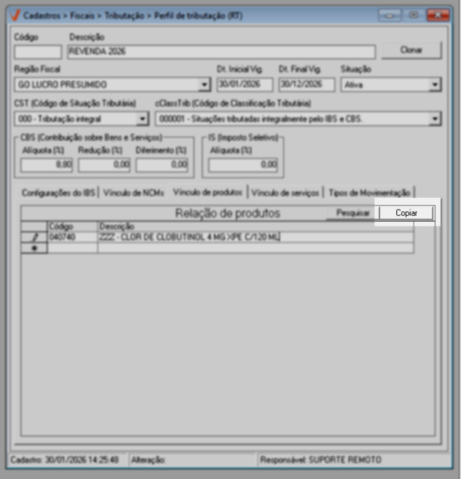Assim como na aba "Vínculo de NCMs", a aba "Vínculo de produtos" disponibiliza o botão >> Copiar para que o usuário possa transferir a lista de produtos para um documento de texto. Acione conforme interesse.