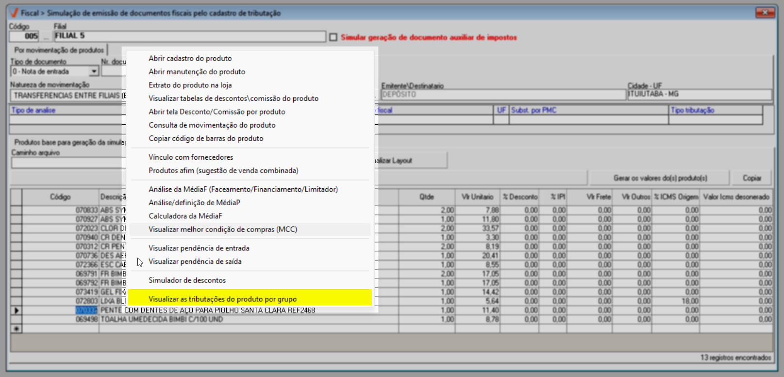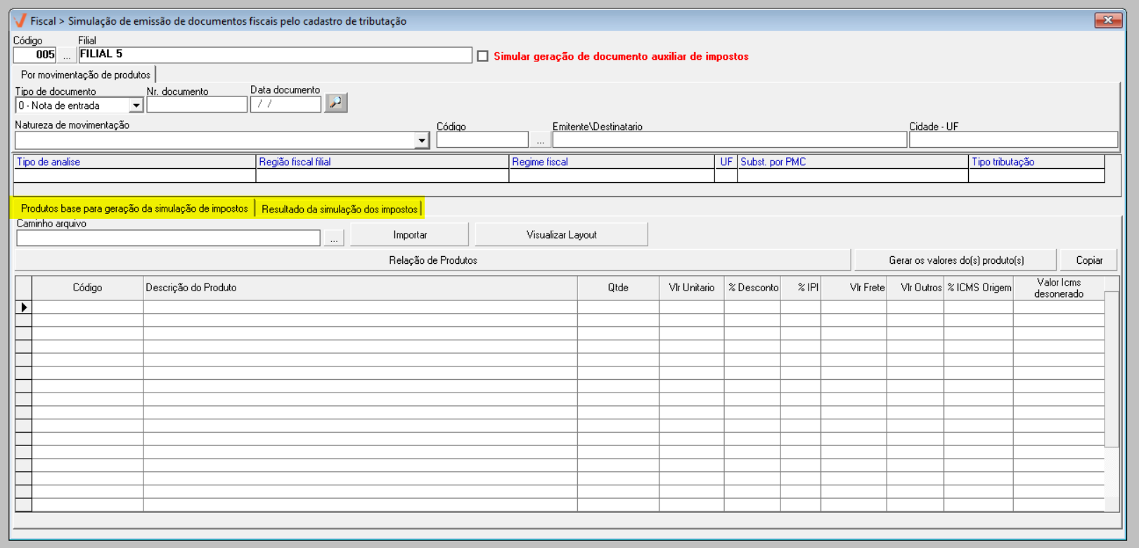 - Acesse o menu Fiscal >> Simulação de emissão de documentos fiscais pelo cadastro de tributação.