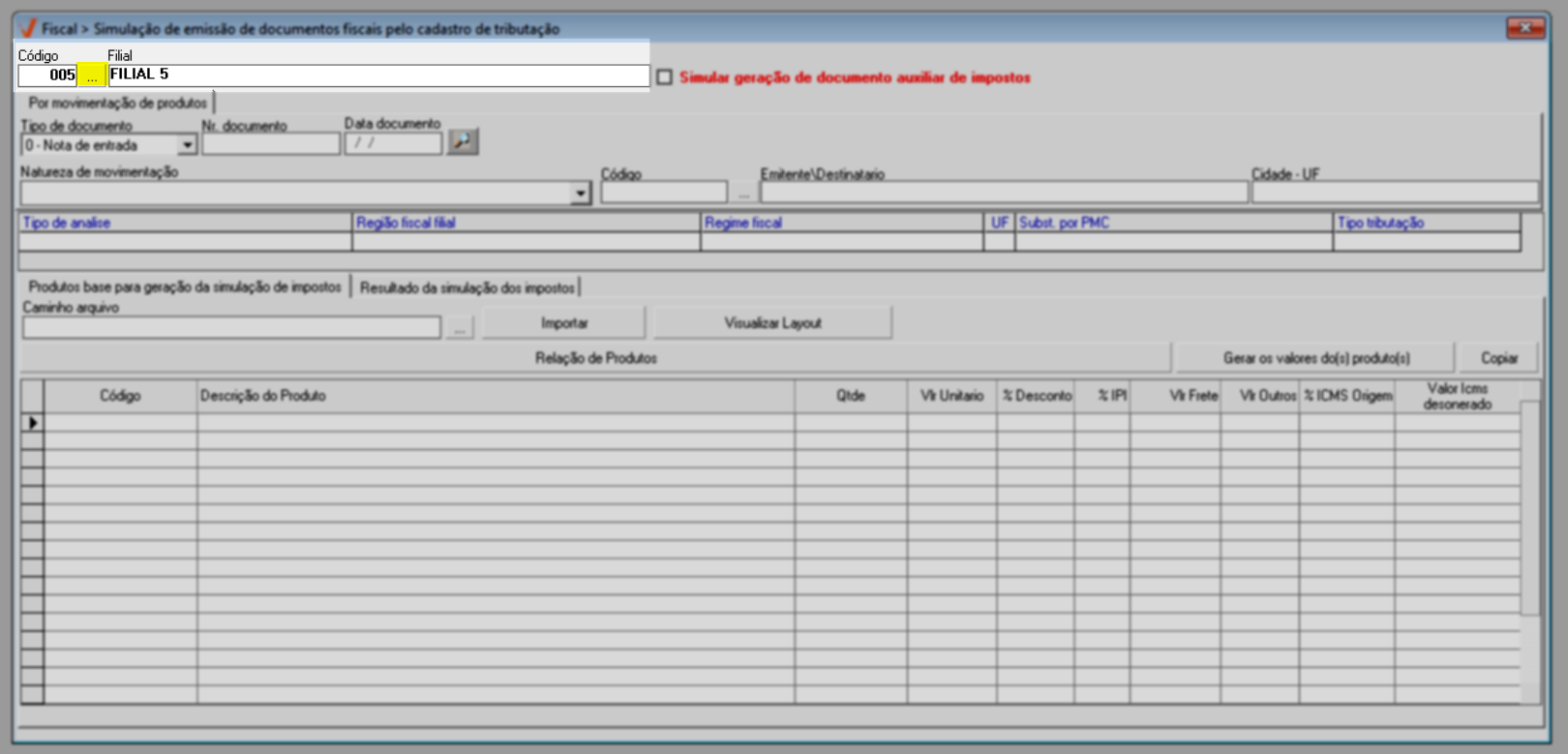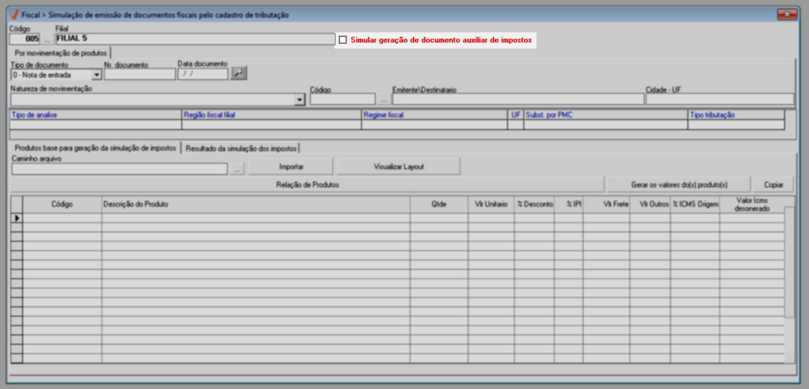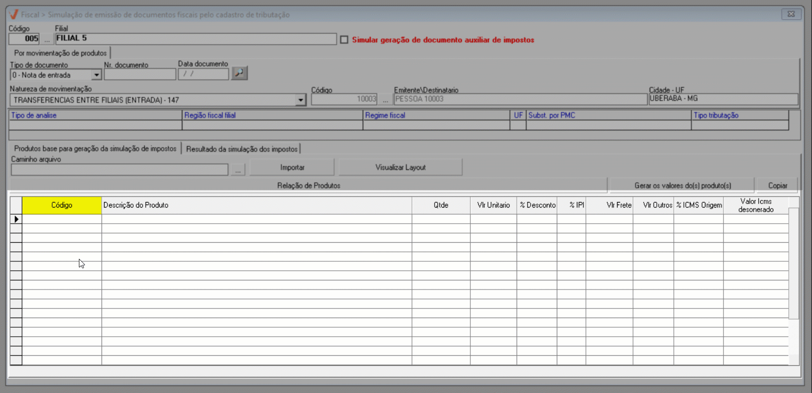 A tela de "Simulação de geração de documentos fiscais pelo cadastro de tributação" do Módulo Fiscal, permite ao usuário realizar uma simulação detalhada das tributações aplicáveis a documentos de entrada e/ou saída, bem como simulações baseadas na natureza de movimentação e nos produtos envolvidos. Essa simulação pode ser realizada para identificação e análise de quaisquer inconsistências tributárias ou configurações que impeçam a correta emissão de um documento fiscal. Essa funcionalidade é fundamental para empresas que buscam compreender e otimizar seus processos fiscais, pois permite uma análise criteriosa dos impactos tributários antes da efetivação das transações. Vale ressaltar que toda a simulação é baseada no cadastro da loja e dos produtos no sistema, abrangendo todas as informações relevantes para a geração a simulação.