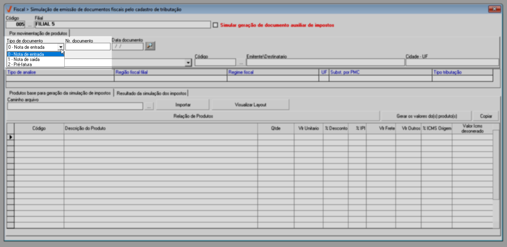 Inicie esse tipo de simulação selecionando no campo "Tipo de documento" uma das opções disponíveis, isto é, "Nota de entrada", "Nota de saída" ou "Pré-fatura". Em seguida, utilize o campo "Nr. documento" para informar o número correspondente. Após tecle >> Enter para carregar os dados.