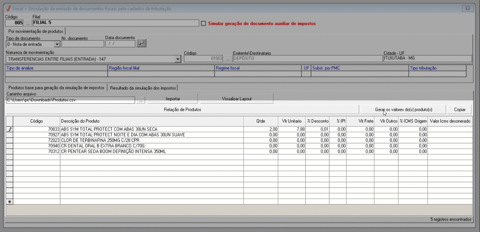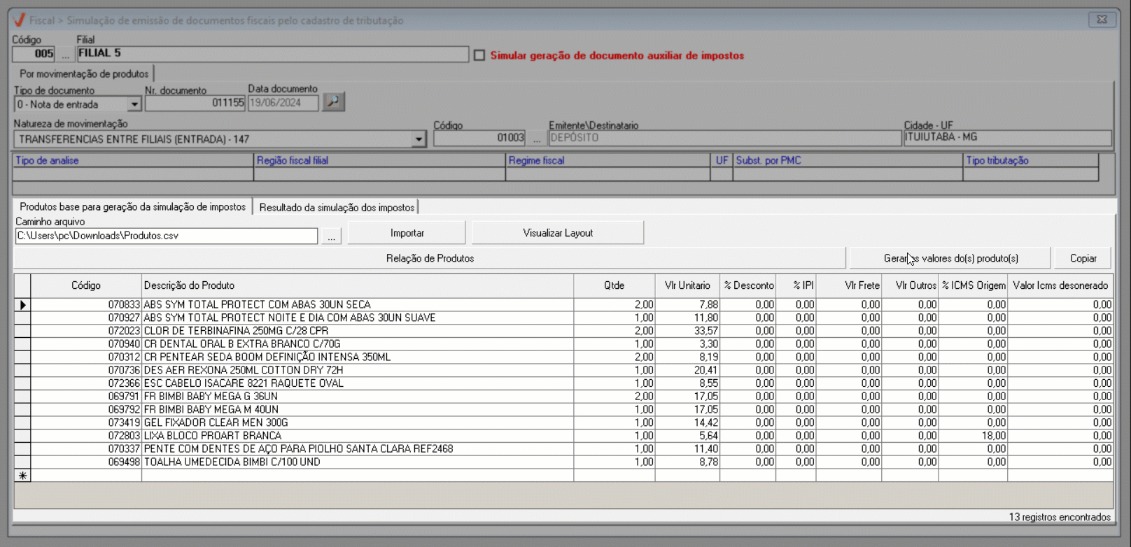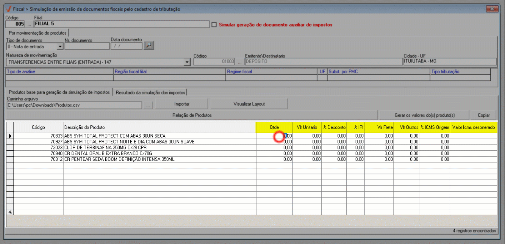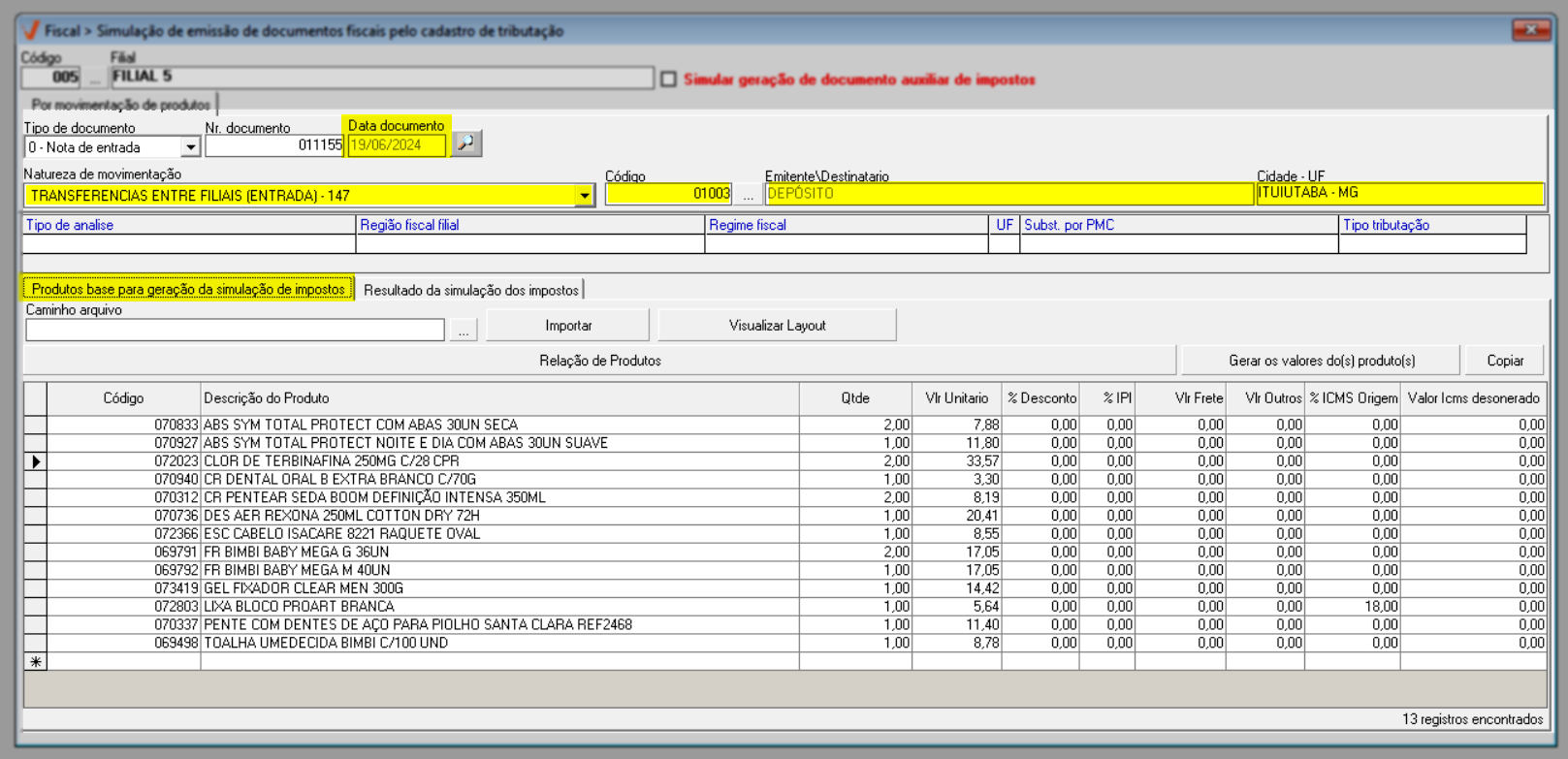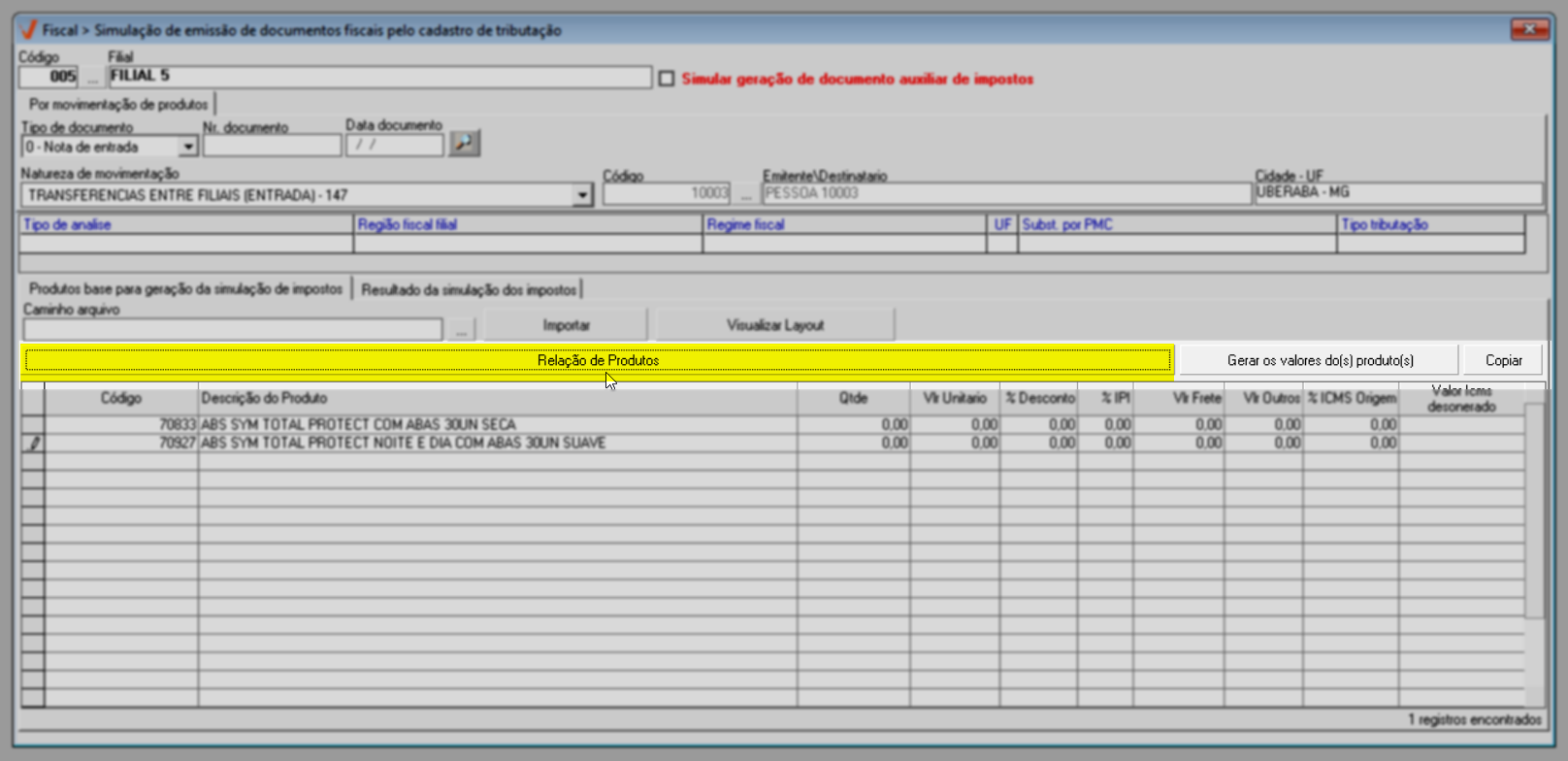 - Para que um documento seja considerado como entrada e/ou saída na simulação, o produto correspondente deve estar previamente registrado no sistema. Clique aqui para acessar a documentação que detalha o cadastro, consulta e edição dos dados de um produto no sistema.