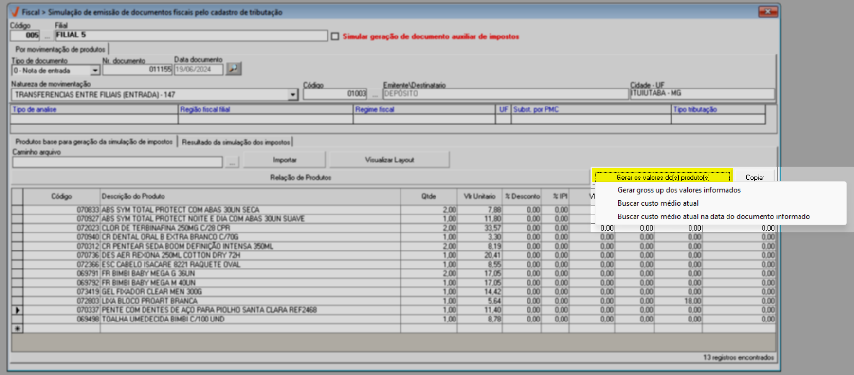 Mas se desejar, o usuário pode clicar no botão >> Gerar os valores dos produtos e em seguida, escolher a opção "Buscar custo médio atual", para aplicar automaticamente na coluna "Vlr. Unitário", o custo médio atual do produto, veja o exemplo a seguir: