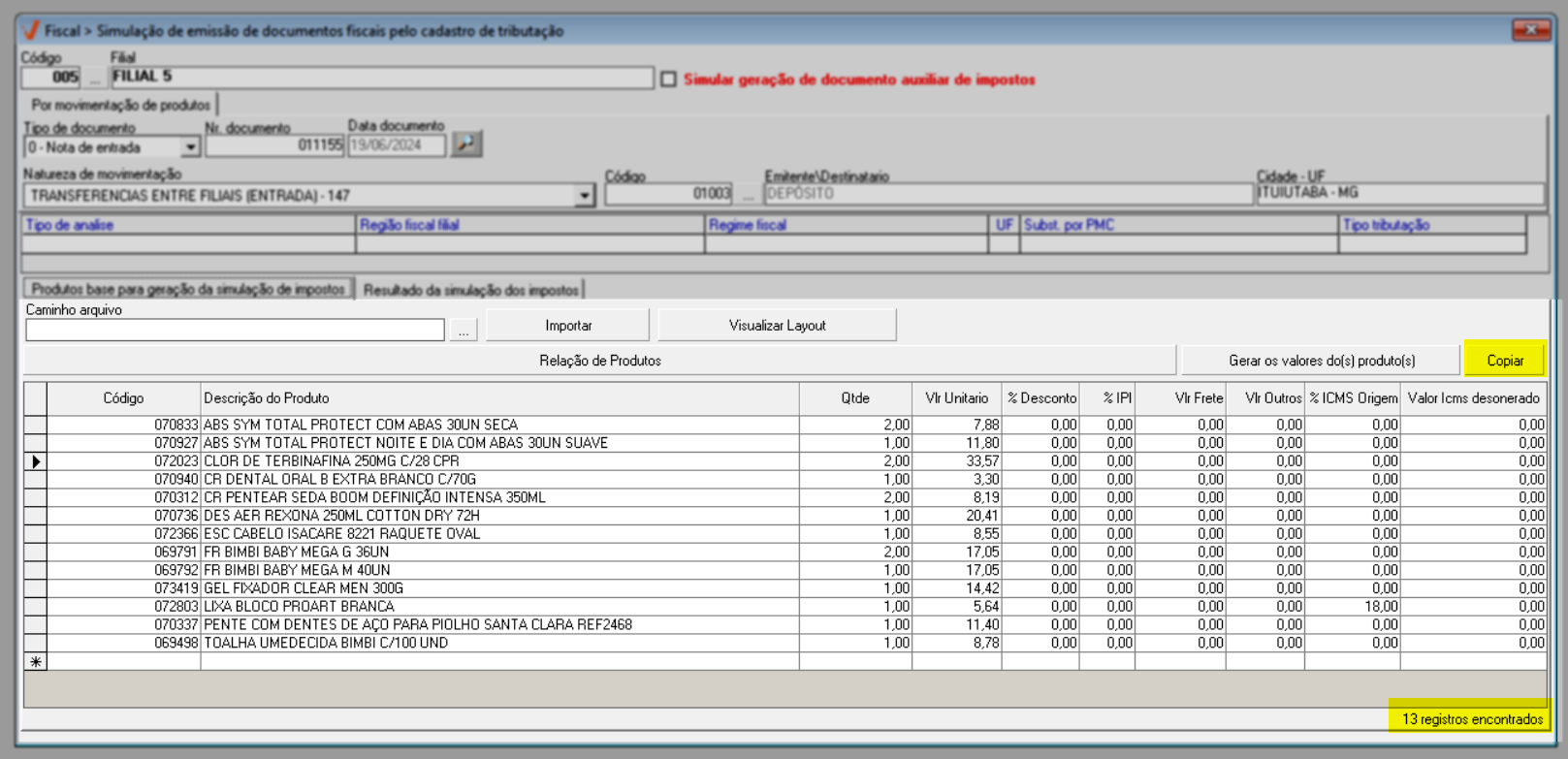 Por fim, no rodapé da tela, fica registrada a quantidade total de produtos, associados ao documento consultado. E se o usuário tiver interesse de copiar essa lista de produtos, bem como todas as informações sobre ele detalhadas na relação, ele poderá clicar no botão >> Copiar. Assim o sistema fará uma cópia dos dados para a memória do computador, assim, basta o usuário colar no diretório desejado.