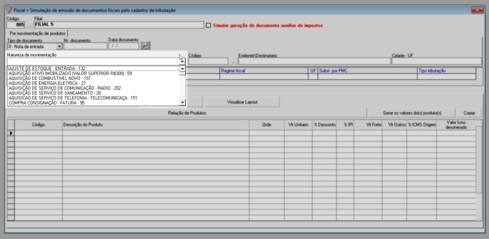Se o usuário optar por realizar a simulação com base em uma relação ou item específico, é essencial primeiro identificar a natureza da movimentação que será aplicada ao produto. Para fazer isso, utilize o campo correspondente:
