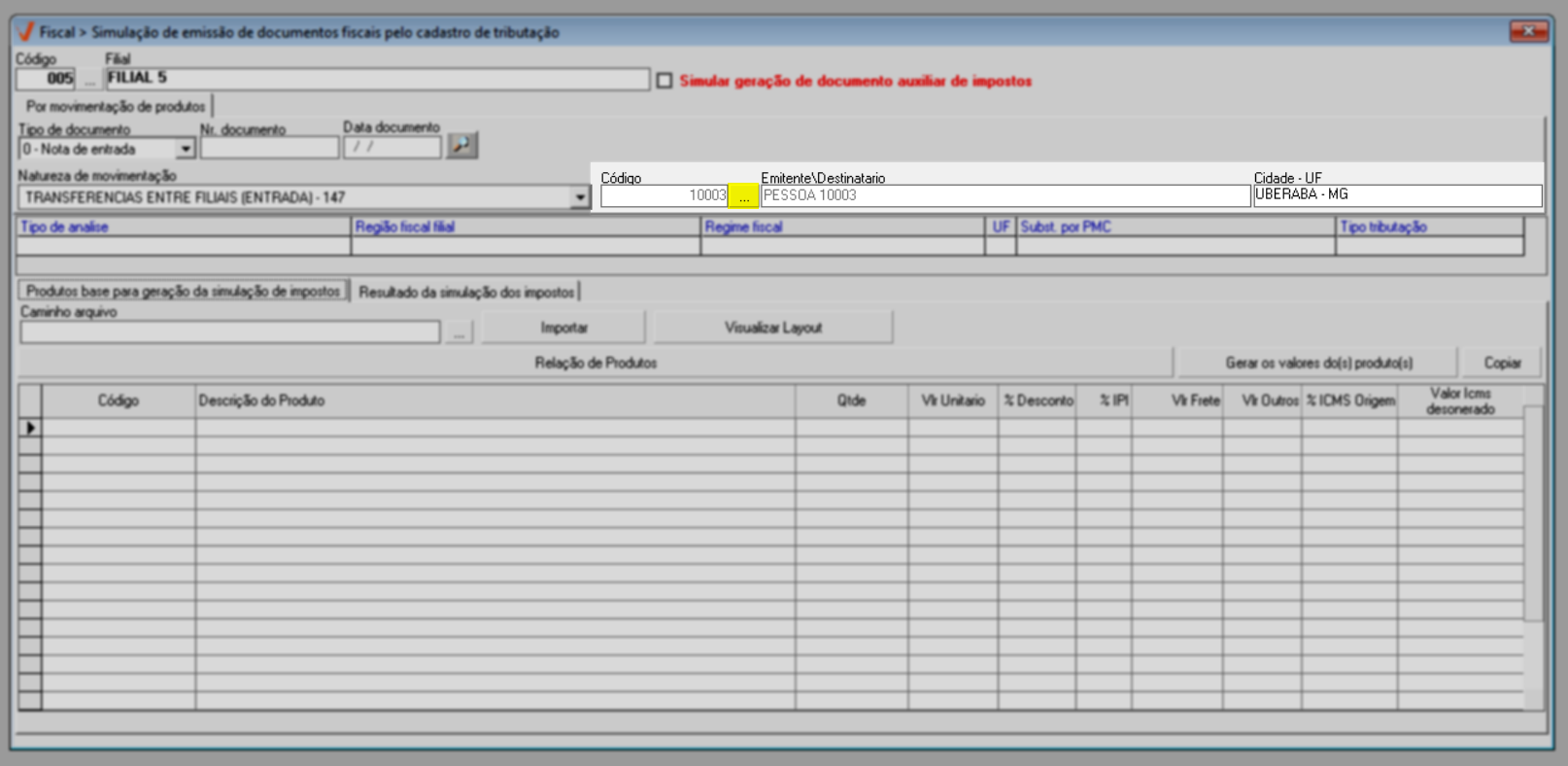 Ao detalhar o documento na tela, o usuário pode visualizar, na seção superior, as principais informações do registro, como a "Data do documento", a "Natureza de movimentação" configurada, o "Código" e o nome do "Emitente/Destinatário", além da "Cidade" correspondente. Logo abaixo, na aba “Produtos base para a geração da simulação de impostos”, são apresentados, na "Relação de produtos", os itens que compõem o documento e que servirão como base para o cálculo e a simulação das tributações.
