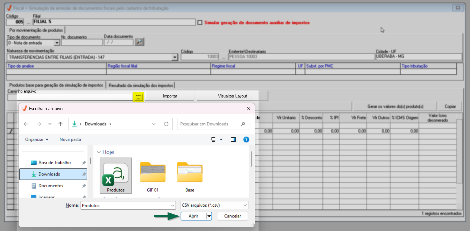 " localizado ao lado do botão >> Importar. A seguir, uma tela será exibida, localize e selecione o arquivo, após, clique em >> Abrir.