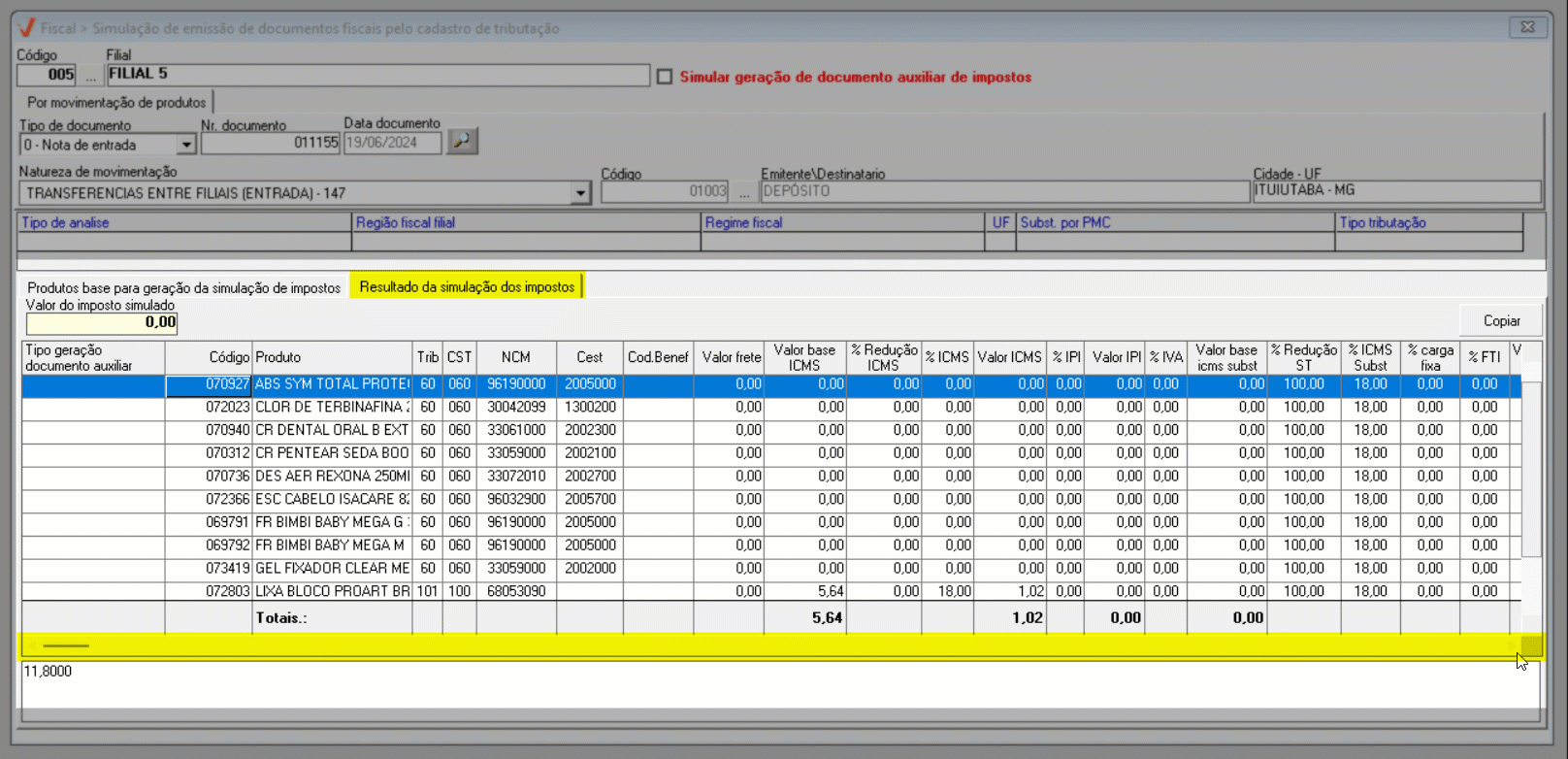 Após acionar o atalho >> F6, o sistema exibirá automaticamente os resultados na aba “Resultado da simulação dos impostos”. Nessa seção, é possível analisar de forma detalhada as projeções tributárias aplicadas aos produtos informados. O resultado apresentado oferece uma visão abrangente das implicações fiscais envolvidas, permitindo ao usuário avaliar com precisão os custos, tributos e impactos financeiros associados à natureza de movimentação selecionada para a simulação. Veja o exemplo a seguir: