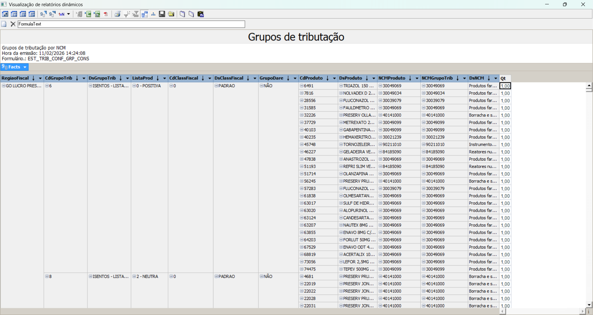 A tela Grupos de Tributação tem como objetivo permitir a consulta e a análise das configurações tributárias dos produtos, com base nos grupos de tributação cadastrados por região fiscal e UF. O relatório pode ser emitido de acordo sob diferentes perspectivas de análise, por tipo de tributação, por grupo de tributação/NCM ou por grupo de tributação/produto, proporcionando uma visão detalhada das configurações fiscais em formato cubo dinâmico. Essa funcionalidade auxilia em análises tributárias, auditorias e conferências cadastrais, garantindo maior controle e consistência das informações fiscais.